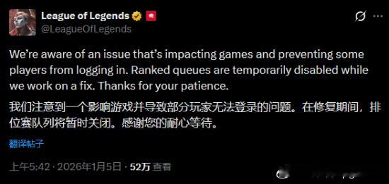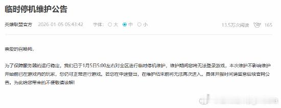 《英雄联盟》全区停机维护据《英雄联盟》官网公告,为保障服务器的运行稳定,游戏已于今日凌晨5点左右对全区进行临时停机维护,维护期间玩家将无法登录游戏。本次维护不影响维护开始前已在游戏内的玩家,您仍可正常进行游戏。但若您在中途登出,在维护结束前将无法再次进入。据《英雄联盟》官推解释称,此次维护是因为发现了一个影响游戏运行并且导致部分玩家无法登录的问题。《英雄联盟》官网补充表示,具体开服时间请留意后续官网公告。