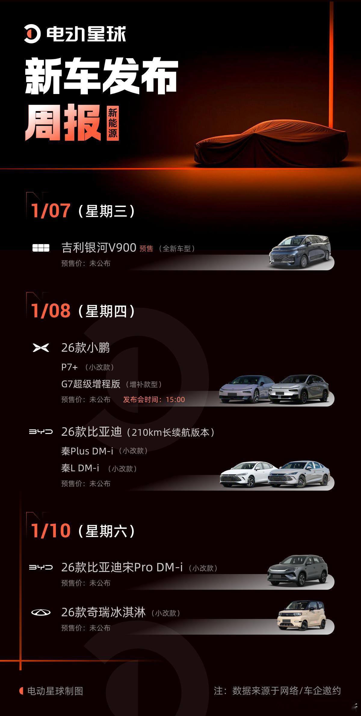 2026 年的第一周,新车也不少吉利 / 小鹏 / 比亚迪多款新车发布,含小鹏 P7+、G7超级增程版、比亚迪秦 Plus DM-i、秦 L DM-i 等新能源汽车比亚迪吉利小鹏