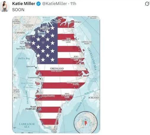 美网红暗示很快拿下格陵兰岛! 当地时间3日,美国白宫高官斯蒂芬·米勒的妻子、保守派网红凯蒂·米勒在社交媒体发帖暗示美国要“拿下格陵兰岛”。随后,丹麦驻美大使耶斯珀·穆勒·索伦森立刻转发了这则网帖并发表评论。 说白了,这哪是网红随便发个帖博眼球,分明是美国把霸权野心摆到了台面上,连遮羞布都懒得挂了。 要知道格陵兰岛再怎么有自治权,那也是丹麦的地盘,美国高官家属公然放话“拿下”,这嚣张劲简直能把人惊掉下巴,说白了就是仗着自己实力强,想把别人的东西直接抢过来。 以前不少人提起美国,总忍不住夸一句文明、先进,觉得那边是所谓的“理想国度”,可看看现在这所作所为,哪还有半分文明的影子? 凯蒂·米勒可不是普通网红,她丈夫是白宫核心政策顾问,更是特朗普的死忠支持者,这种身份的人发“很快”两个字配上带美国国旗的格陵兰岛地图,明眼人都能看出来是在释放信号。 要知道格陵兰岛就是个地下宝库,光稀土储量就有150万吨,这可是芯片、新能源产业的核心材料,美国自己缺就惦记上别人的,完全不管这是丹麦的领土。 更让人咋舌的是美国这说抢就抢的霸道性子,远的不说,就说最近委内瑞拉的事,马杜罗是正经的合法总统,就因为不顺着美国的心意,美国居然直接发动军事行动,深夜派了上百架飞机突袭,把人从被窝里抓出来带回美国受审。 这场代号“绝对决心”的行动,美军筹划了好几个月,连马杜罗的饮食习惯、出行路线都摸得一清二楚,特朗普还在海湖庄园实时观看全程,完事了还大言不惭地炫耀。 这种无视他国主权、随便抓捕别国元首的行为,说一句流氓都算轻的。 美国为啥能这么肆无忌惮?还不是因为手里有钱有武力,缺石油了就去抢产油国的资源,缺稀土了就盯着格陵兰岛不放,自己印点钞票就能在全世界疯狂采购,把全球的财富都往自己兜里装。 反观被盯上的国家,要是一味退让,只会让美国得寸进尺,就像现在的丹麦,驻美大使赶紧转发评论表态,这已经是初步的态度,要是再软弱下去,美国说不定真会把“暗示”变成实际行动。 毕竟对美国来说,只要是能满足自己利益的,不管是盟友的地盘还是弱小国家的资源,都敢伸手去抢,面对这样的暴风雨,只有拿出果断的决心和勇气捍卫自己的权益,才能不被欺负。 说到底,美国的这些操作,本质上就是把世界当成了弱肉强食的丛林,只要自己需要,就不管不顾别人的主权和利益。 以上仅为个人看法,大家觉得美国这番操作够霸道吗?面对这样的霸权行径,被盯上的国家该如何应对?欢迎在评论区留下你的观点。