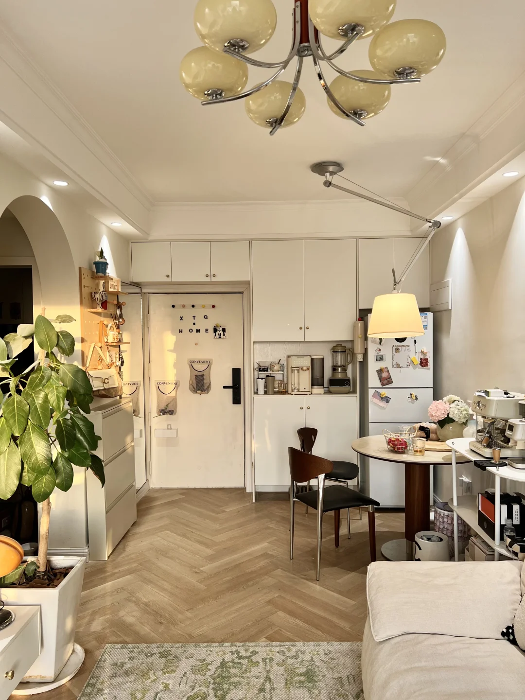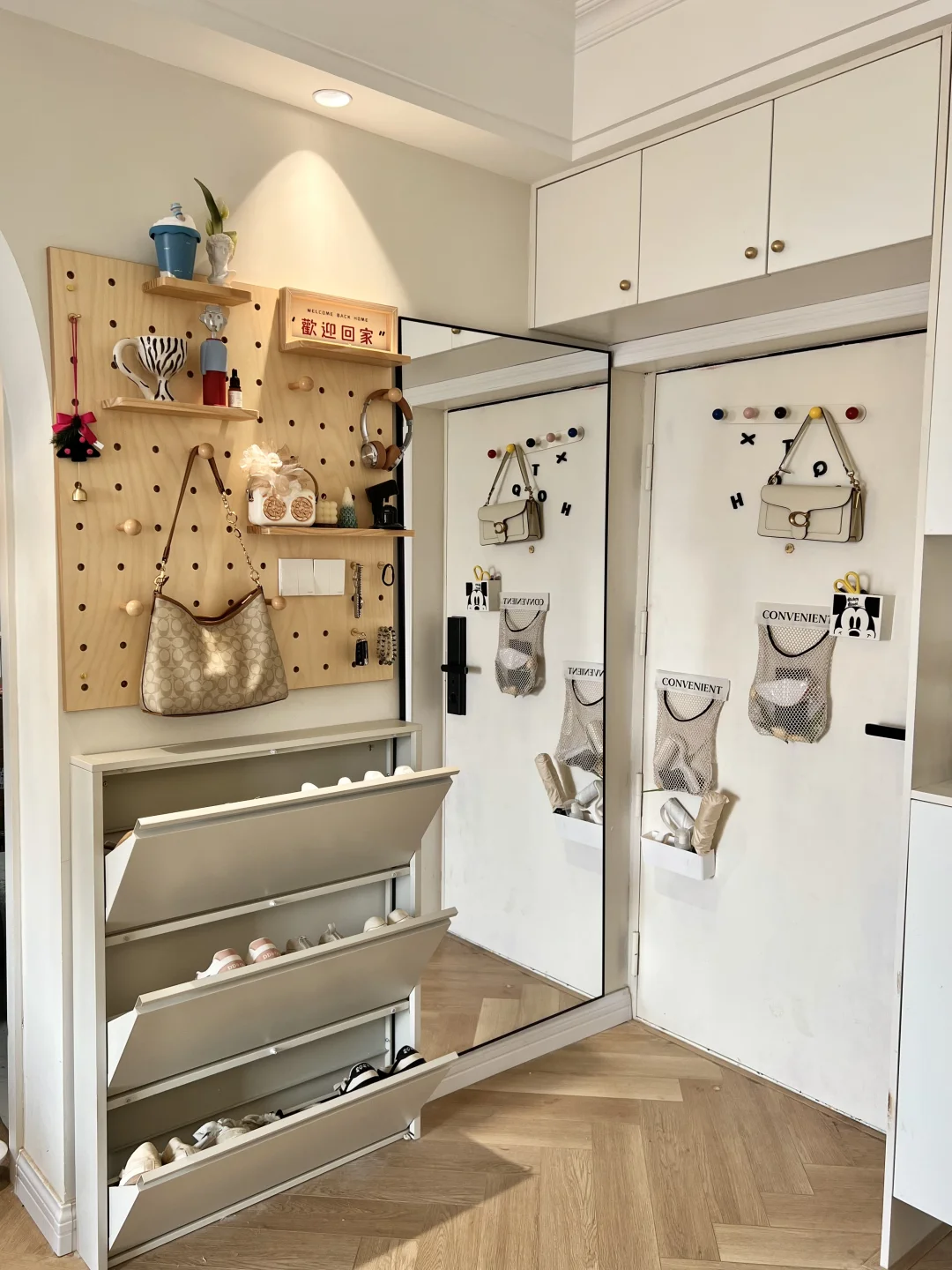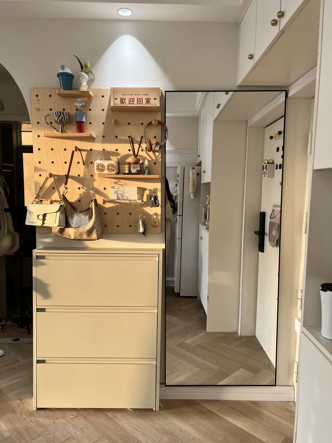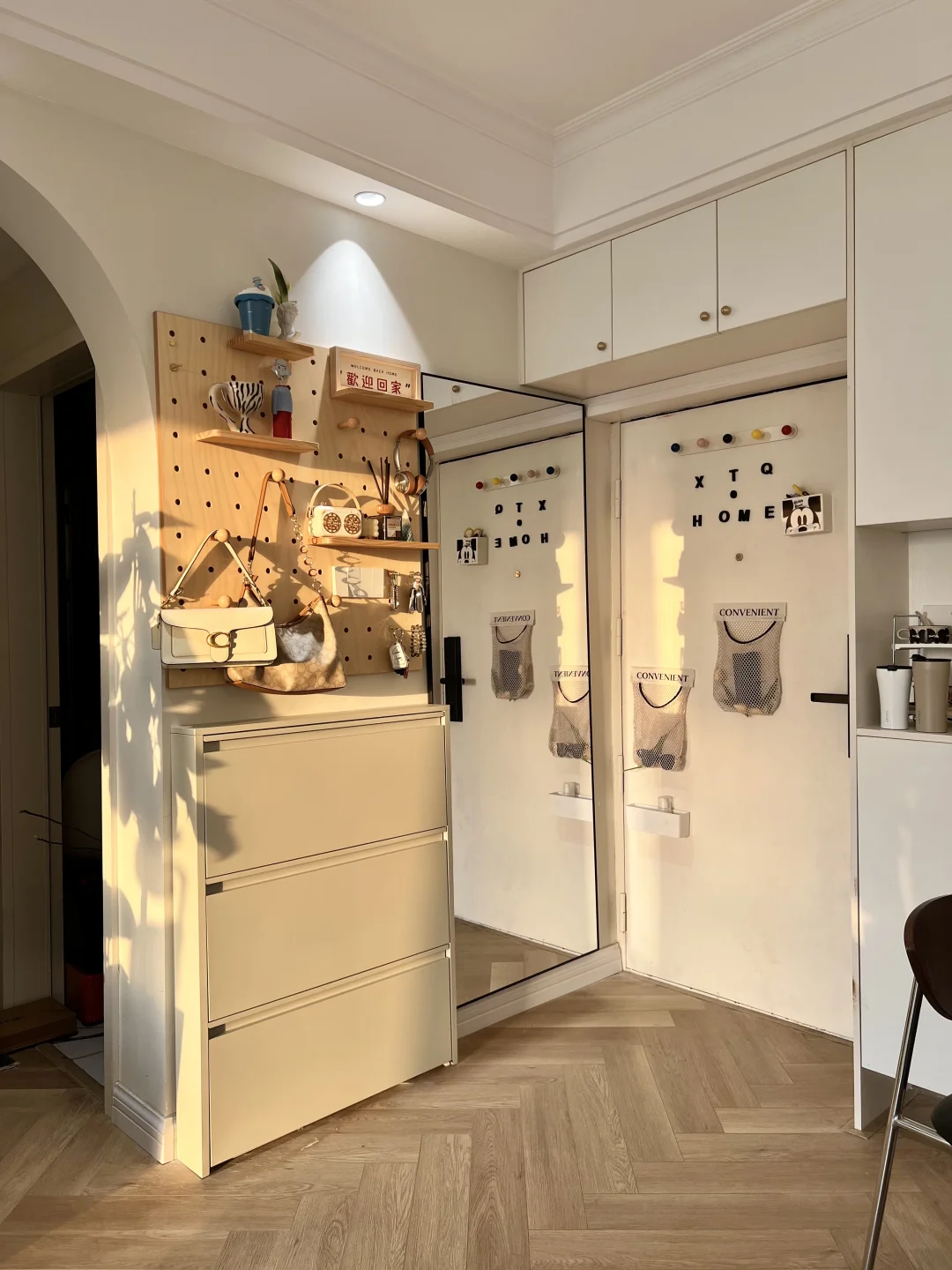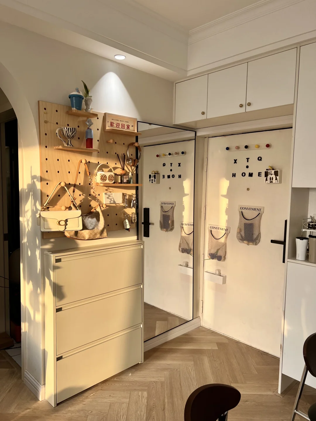 一室一厅的🏠 不知不觉入住小家已有3年了 从一开始的空空荡荡变成了满满当当的样子 一人两猫🐱 东西变得越来越多 收纳也就越来越重要啦! 于是开始不断改造ing 因为有办公需求 所以把阳台腾出来了一个办公桌 一平米玄关也不能放过 特地定制了洞洞板➕超薄鞋柜➕全身镜 玄关顿时大了好多! 也更方便收纳了 小小的家🏠 东西稍微一多就略显凌乱~ 好在拥有好好生活的能力 一切都很幸福~
