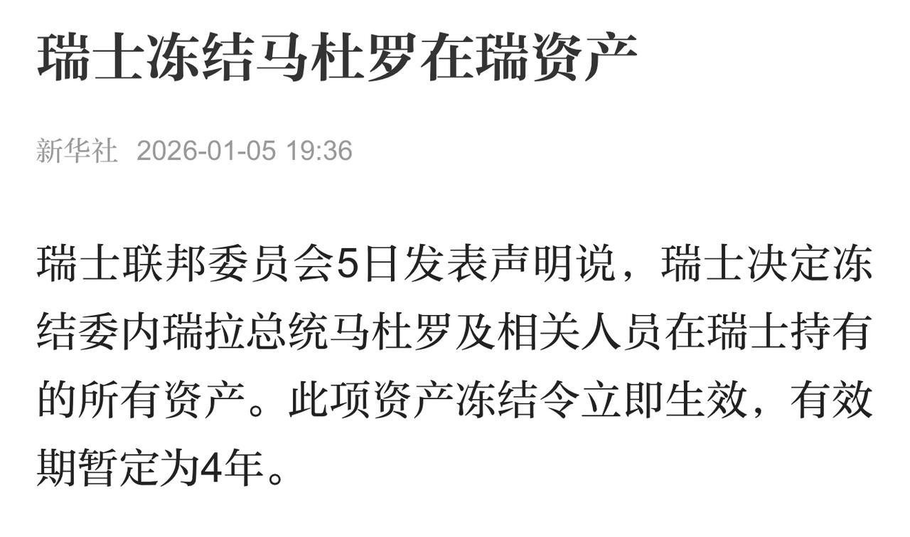 瑞士冻结马杜罗在瑞资产 新华社 2026-01-05 19:36 瑞士联邦委员会5日发表声明说,瑞士决定冻结委内瑞拉总统马杜罗及相关人员在瑞士持有的所有资产。此项资产冻结令立即生效,有效期暂定为4年。