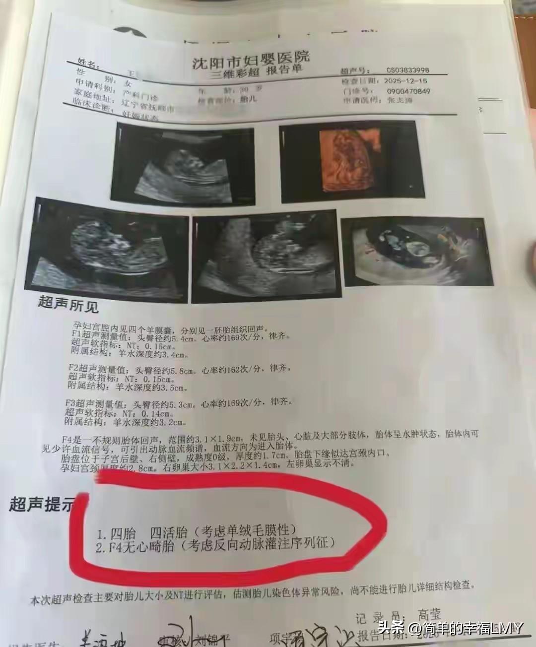 解释不清了!辽宁抚顺,一女子怀孕以后,进行了4次产检,每次检查都发现多出一个胎儿,2个月直接从1胎变成4胞胎。医生说:概率只有1500万分之一! 你见过怀孕两个月,肚子里的孩子从一个变成四个的奇事吗?辽宁抚顺一位30岁的王女士,就亲身经历了这样一场医学奇迹与命运考验交织的旅程。这事听起来像天方夜谭,可偏偏真实发生了——而且概率低到只有1500万分之一! 去年9月,王女士自然受孕,一切看起来再普通不过。头一回产检,医生告诉她怀的是单胎,她和家人心里踏实又欢喜。谁料第二次检查时,B超屏幕上赫然多出一个小生命,双胞胎! 这消息让全家乐开了花,仿佛老天爷额外送了份厚礼。可惊喜还没捂热乎,第三次产检竟又冒出第三个胎儿!三胞胎?她当场愣住,心里直打鼓:是不是机器出错了?还是医生看花了眼? 毕竟前两次已经“凭空”多了一个,这次再添一个,未免太玄乎了吧?为了求个准信,她果断换医院复查。结果新医院的报告清清楚楚写着:三胎共存,这下她不得不信了。 可命运似乎觉得还不够戏剧性,第四次产检时,屏幕上竟又多出一个心跳信号——四胞胎!四个小生命同时在她腹中安家落户,这哪是怀孕,简直是上演现实版《西游记》里的“四小圣”下凡! 更令人咋舌的是,医生确认这是同卵四胞胎。什么叫同卵?就是由同一个受精卵分裂而来,基因几乎完全相同。这种情形本就凤毛麟角,全球记录寥寥无几。 医学界普遍认为,同卵双胞胎已属罕见,三胞胎更是百万中无一,而四胞胎?那概率直接跌到千万分之一的深渊里。王女士撞上的,不是运气,是宇宙级别的巧合。 可奇迹背后,往往藏着荆棘。医生面色凝重地告诉她:第四个宝宝目前没有检测到胎心,它的血管与其他三个胎儿紧密相连,靠兄弟姐妹“输血”维生。 这种情况极其危险——一旦供血失衡,四个孩子都可能因心脏负担过重而出现先天性心衰。换句话说,一个弱小的生命,正在拖累整个“团队”的生存机会。 更棘手的是,若后续检查发现某个胎儿心脏发育异常,医学上通常建议“减胎”,也就是终止部分妊娠以保全其余。但同卵四胞胎共享胎盘与血管网络,贸然减胎极可能引发连锁反应,导致全部流产。 有人或许会问:既然这么危险,为何不早点干预?可你知道吗?对一位母亲而言,“放弃”从来不是轻飘飘两个字。王女士说:“有四个宝宝同时来找我当妈妈,这是莫大的缘分。” 眼下,她和家人已决定奔赴上海、安徽等地的顶尖产科医院复诊。这不是逃避,而是主动出击。面对如此罕见的妊娠,基层医疗资源确实有限,唯有借助更高水平的医学团队,才可能为四个孩子争取一线生机。 我们常把“母爱伟大”挂在嘴边,可真正震撼人心的,往往是那些在绝境中仍不肯松手的母亲。王女士的故事之所以打动人心,不仅因为医学奇迹,更因为她面对未知时那份清醒又坚定的选择。 她知道前路凶险,却不愿轻易割舍任何一个孩子。有人说,生命自有其韧性。可这份韧性,往往需要有人用血肉之躯去托举。或许正如古人所言:“天地有大美而不言。”有些相遇,本就不讲道理。 值得提醒的是,类似极端多胎妊娠虽罕见,却并非毫无警示意义。对于普通孕妇而言,定期规范产检仍是保障母婴安全的基石。尤其在孕早期,胚胎发育变化迅速,一次B超未必能定终身。 若发现胎数异常增多,务必及时转诊至具备高危妊娠处理能力的医疗机构。王女士的经历特殊,但她的应对方式——多方求证、积极转诊、科学决策——却是每个准父母都该借鉴的范本。 此外,社会对多胎妊娠的认知也需更新。不少人一听“四胞胎”就只想到喜庆热闹,却忽视其背后高达70%以上的早产率、低体重率及母婴并发症风险。 真正的祝福,不该止于“恭喜”,更应包含理解与支持。比如,是否该为这类家庭开通绿色就医通道?医保政策能否覆盖更多特殊产检项目?这些思考,或许比单纯感叹“奇迹”更有价值。 回到王女士身上,她的故事还在继续书写。四个小生命能否平安降世?第四个宝宝的心跳会不会奇迹般出现?没人敢打包票。但可以确定的是,无论结局如何,她都已经用行动诠释了何为“为母则刚”。 人生在世,有些缘分来得猝不及防。它可能是一场暴雨,也可能是一束光。对王女士而言,这四个小家伙的降临,既是天赐的厚礼,也是命运设下的考题。 她没有退缩,而是挺起尚不显怀的肚子,走向更大的城市、更高的山峰,只为给孩子们多争一口气。最后想说,别总以为奇迹遥不可及。愿医学之光护佑这四个小生命,愿王女士的坚持终得圆满。 消息来源:极目新闻辽宁一孕妇两个月内从一胎变四胞胎