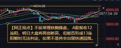 【1月5日A股收评:明日大盘将再创新高 但能否形成13连阳暂时无法判定 如果不是将会出现快速回落】 盘前分析准确地判断了“今日大盘大概率高开,能否高走重点观察成交量变化”,市场高开高走迎来2026年开门红,创业板指领涨,沪指重回4000点上方,录得12连阳。两市成交额25463亿元,较上一个交易日放量5011亿。个股涨多跌少,参与今日交易的5170只个股中,3958只收红,涨超9%个股178只。 盘面上,脑机接口、商业航天等热点全面开花,板块角度看,脑机接口概念全天领涨,30余只成分股涨停,三博脑科、美好医疗、创新医疗涨停;保险板块爆发,新华保险、中国太保大涨续创历史新高;商业航天概念反复活跃,雷科防务4连板,中国卫通5天3板;半导体产业链走强,亚翔集成、圣晖集成等多股涨停;AI应用概念表现活跃,蓝色光标2连板;海南自贸概念集体大跌,海南发展跌停。 指数表现:沪指涨1.38%,报收4023.42点;深成指涨2.24%,报收13828.63点;创业板指涨2.85%,报收3294.55点。 板块表现:512个板块中,494个收红,脑机接口、医疗器械、商业航天、 保险、半导体产业链等板块涨幅居前;海南自贸概念、多元金融、机场航运、旅游及酒店等板块跌幅居前。 资金表现:大盘资金全天净流出25.48亿元,其中上证净流入26.48亿,深证净流出51.97亿。 两市成交:两市全天成交额25463亿元,较上一个交易日成交额放量5011亿元,上证成交10673亿元,较上一个交易日成交额放量2378亿元。 明日猜想:指数放量大涨,留下了6.04点的跳空缺口,是年前11连阳的加速还是新一波行情的开启?目前的A股已经不按常理出牌,这种铁腕操盘的手法,除国家大主力外,不可能是其他。预计明日大盘将再创新高,会不会形成13连阳,暂时无法判定,如果不是,那么就是创新高后冲高回落,并且是快速回落。