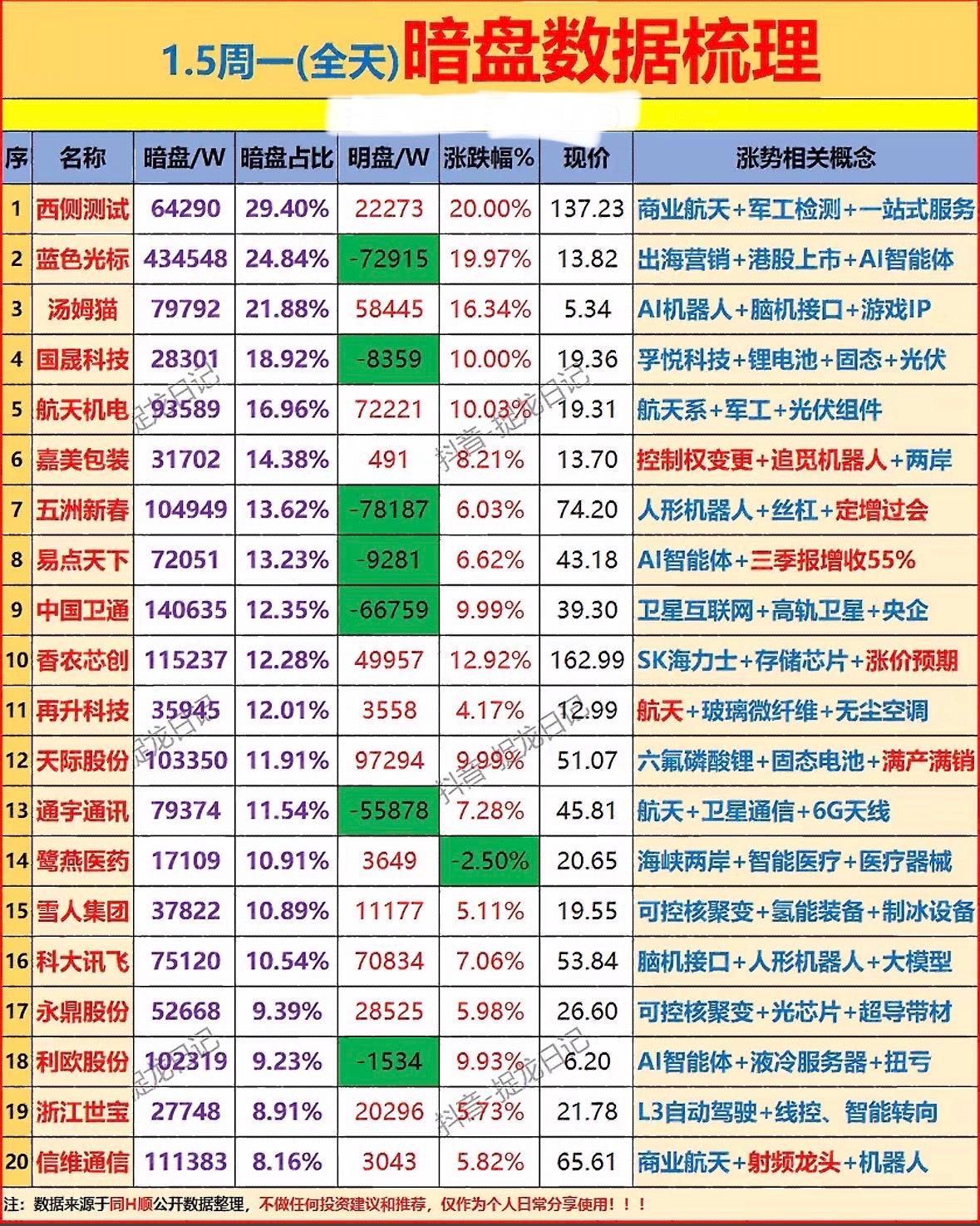 暗盘数据大揭秘! 📈📊 周一大盘走势分析,带你解锁隐藏财富!💰🔍 暗盘热点:商业航天、AI机器人、光伏组件、存储芯片、脑机接口等概念股活跃,涨势亮眼。