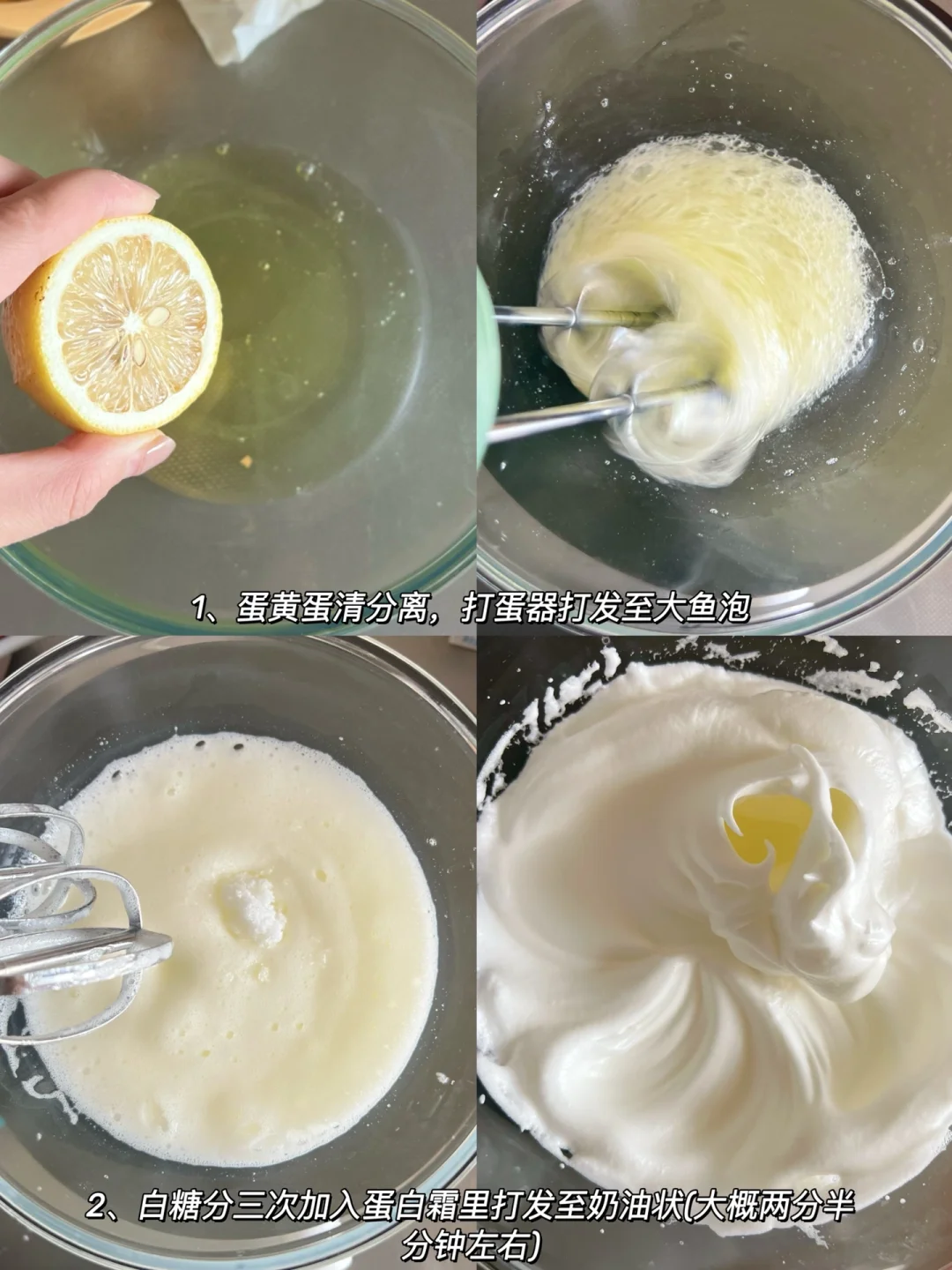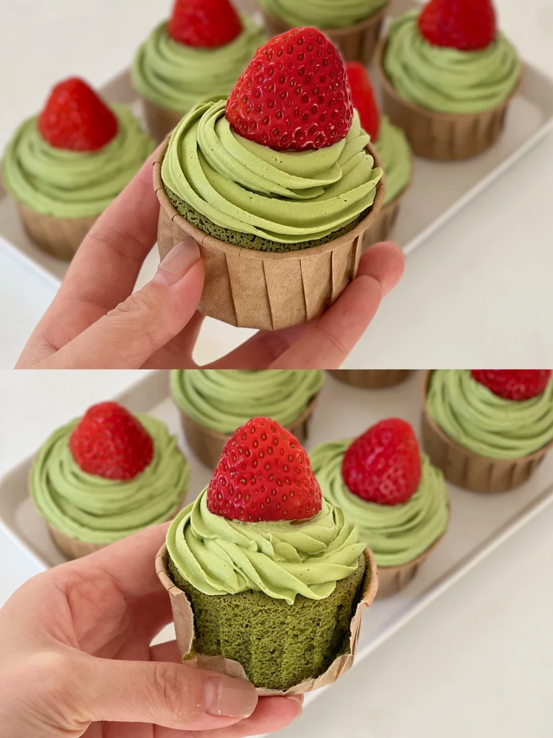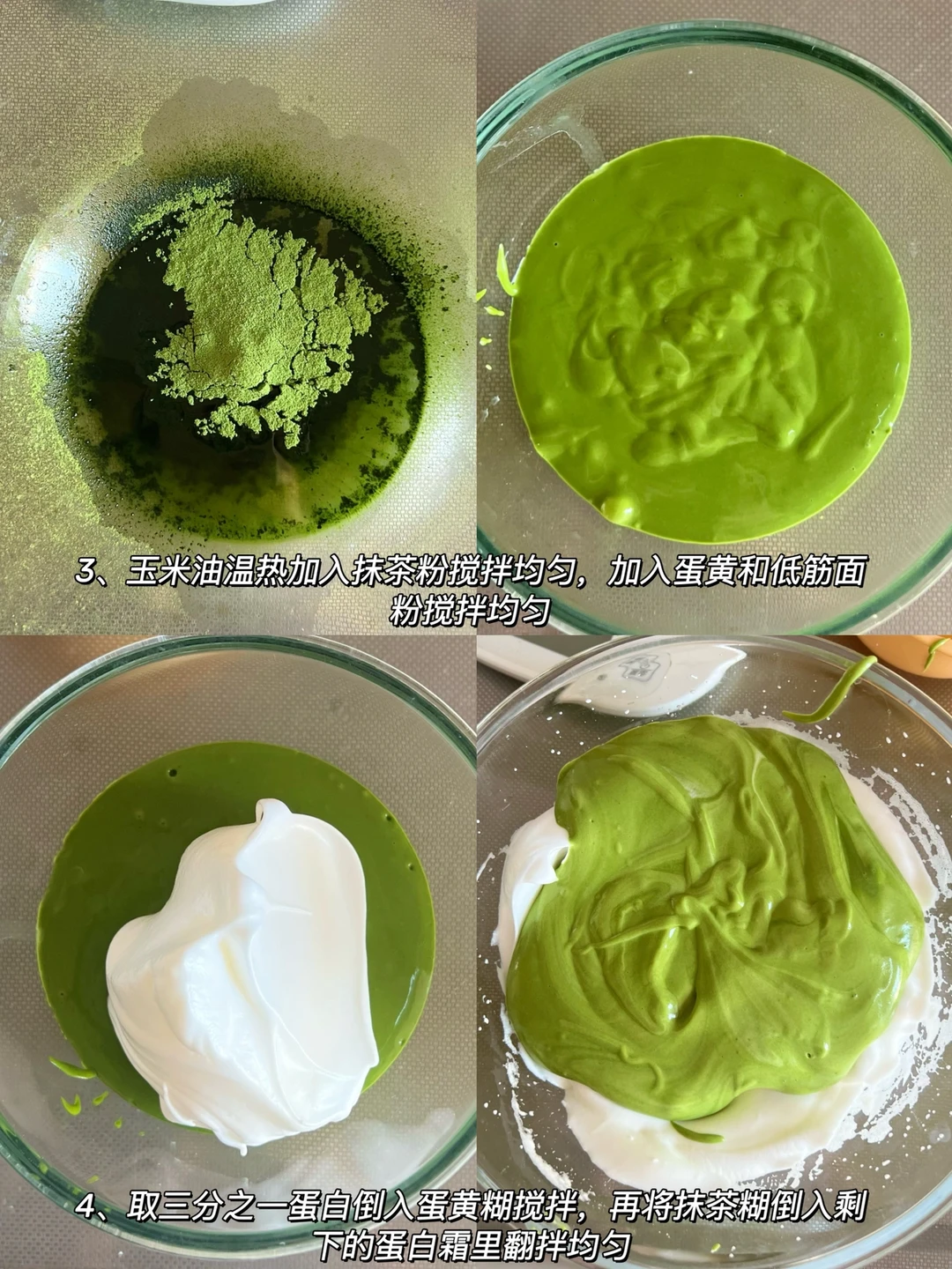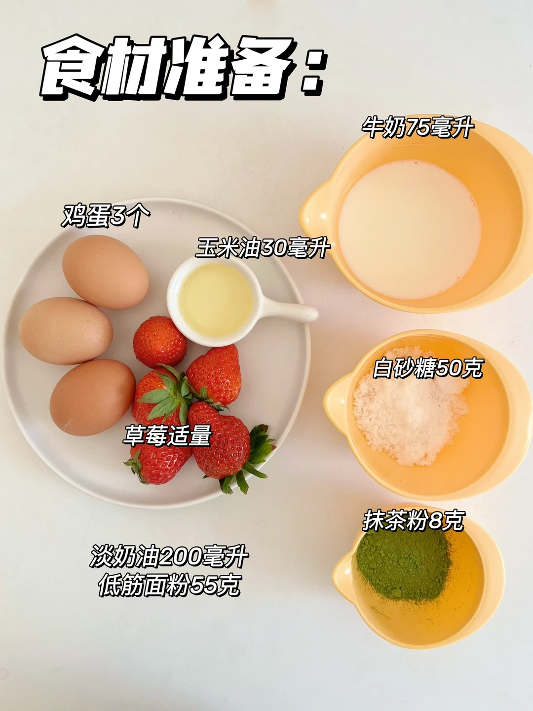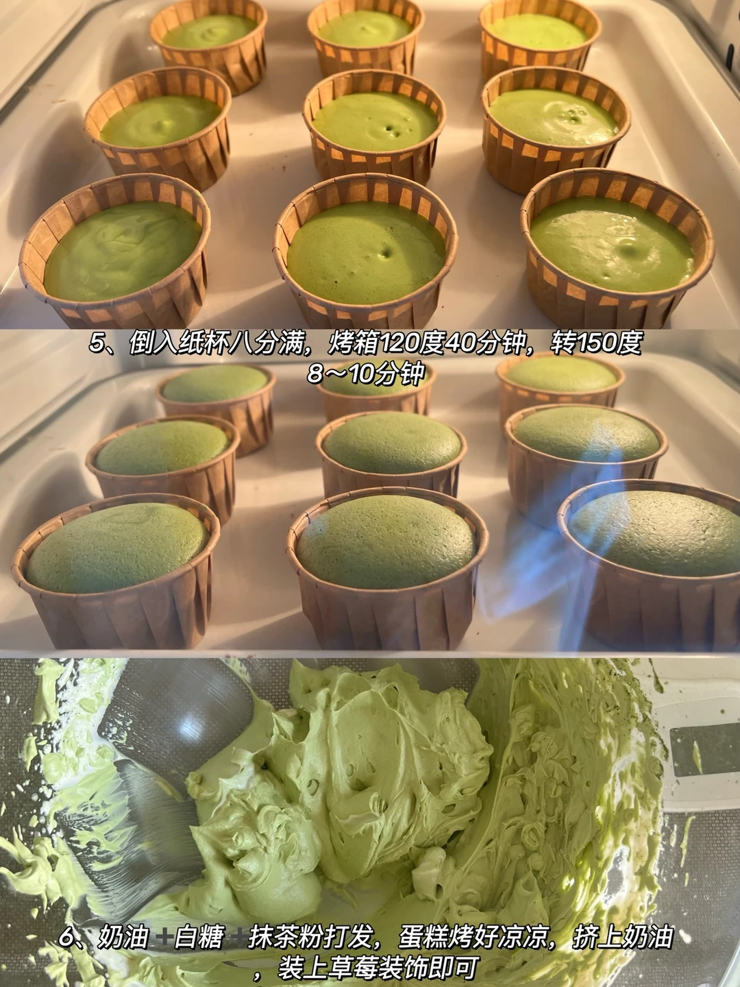 圣诞节就快到啦,又给大家分享纸杯蛋糕啦,简单又好看,姐妹们安排起来 食材👩🏻‍🍳: 鸡蛋3个、草莓适量、低筋面粉 55克、抹茶8克、细砂糖50克(蛋白霜30克十奶油20克) 牛奶 75毫升、玉米油30克、淡奶油 200毫升 ⚠️蛋清打发 1、蛋清一定要放在无油无水的盆里!可以放冰箱冷冻 15分钟再打发,更稳定,但是不放也可以的 2、打发时间我计算了一下从打发大鱼泡开始到结束大 概2分钟30秒,就差不多了,最后的状态就是奶油质 地,很光滑很细腻 3、打发最后一次把打蛋器倾斜沿着边去打发,这样更 彻底,打的也会更好 制作步骤👩🏻‍🍳 1、翻拌蛋黄糊的时候一定要z型手法 2、翻拌蛋黄糊和蛋白霜的时候控制在30秒以内,不然 容易消泡 3、烤箱温度 110~120度烤 40 分钟,然后转150度烤8 ~10分,最后一定要观察,我的烤箱120度40分钟就 差不多了,一定要中下层!还有温度尽量低烤久一些再 转,就基本不会塌陷!! 4、烤出来之前闷5分钟,然后拿出来轻震一下也会更 好,倒扣过来,不过如果趁热倒扣表面会有痕迹,可以 垫油纸哈 5、白砂糖大家也可以根据自己口味调节哈,最后挤在 纸杯蛋糕上,然后可以装饰各种水果啦!