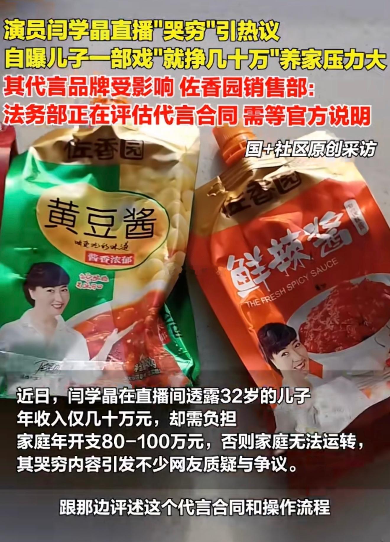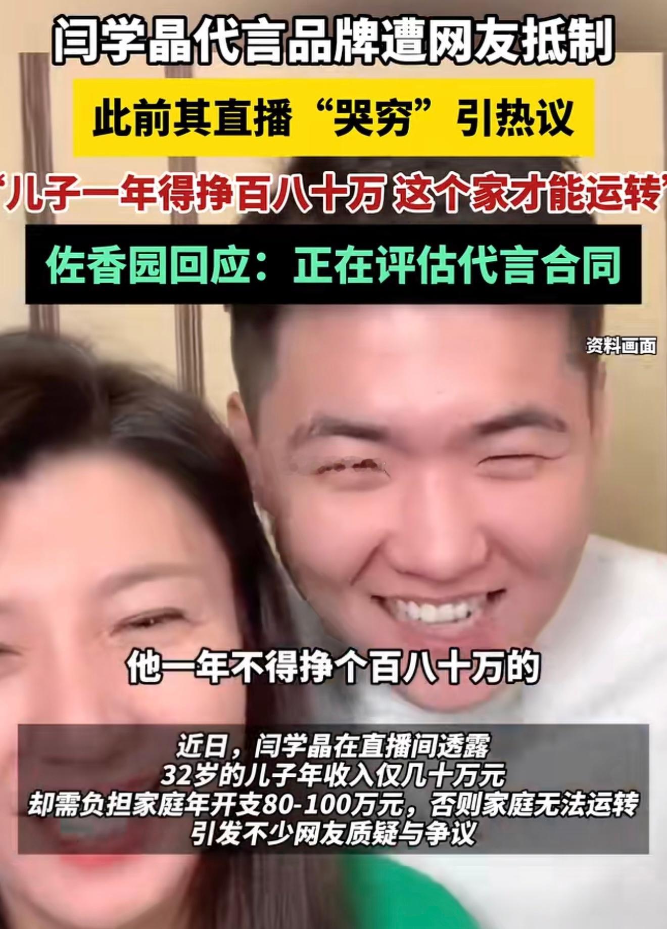 演员闫学晶直播“哭穷”引争议,称儿子年收入仅几十万无法承担一家开销,其代言的品牌受影响产品被网友抵制,佐香园销售部:法务正在评估代言合同。网友称直播卖惨,漠视民生,宣扬奢靡,无道德底线,建议全网封杀,你们支持吗?