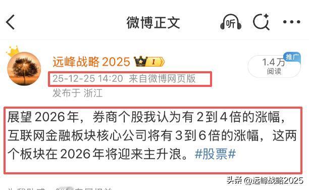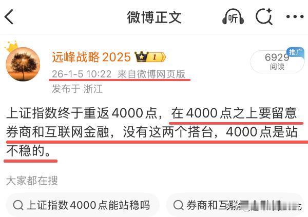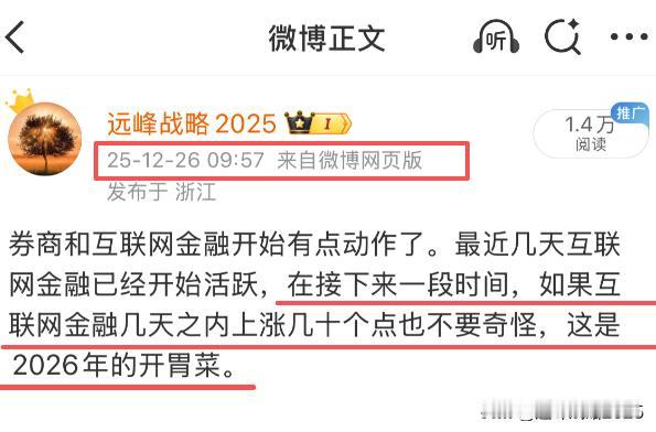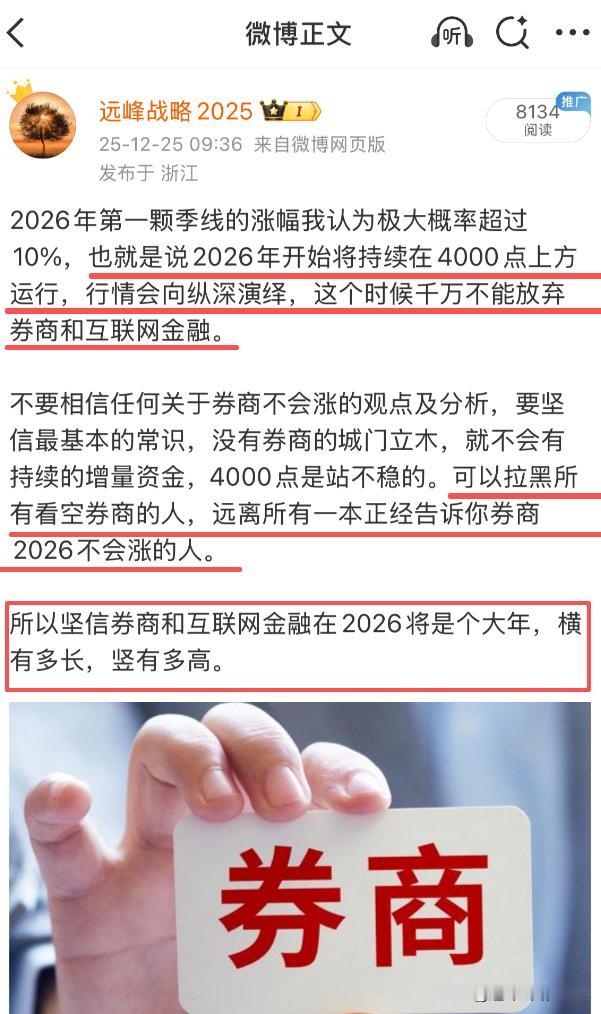 券商互联网金融终于开始发飙了,等地太久了,真是泪流满面啊。我反复地说,在4000点之上,如果没有券商和互联网金融的参与,是不现实的,大盘也就无法在4000点上方稳定地运行。 不管今天以及明天券商能不能持续挺住,从此就告别4000,我认为不重要,重要的是券商今年也就是2026丙午年必须暴涨,否则就不足以吸引场外资金,也不足以挺立起资本市场的大牛 言归正传,过去我说过,2026年,坚定拉黑关于券商不会涨的观点及分析,要坚信最基本的常识,没有券商的城门立木,就不会有持续的增量资金,4000点是站不稳的。可以拉黑所有看空券商的人,远离身边一本正经告诉你券商2026不会涨的人。