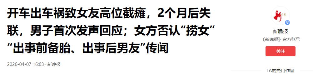 新晚报:开车出车祸致女友高位截瘫,2个月后失联,男子首次发声回应;女方否认“捞女”“出事前备胎、出事后男友”传闻
