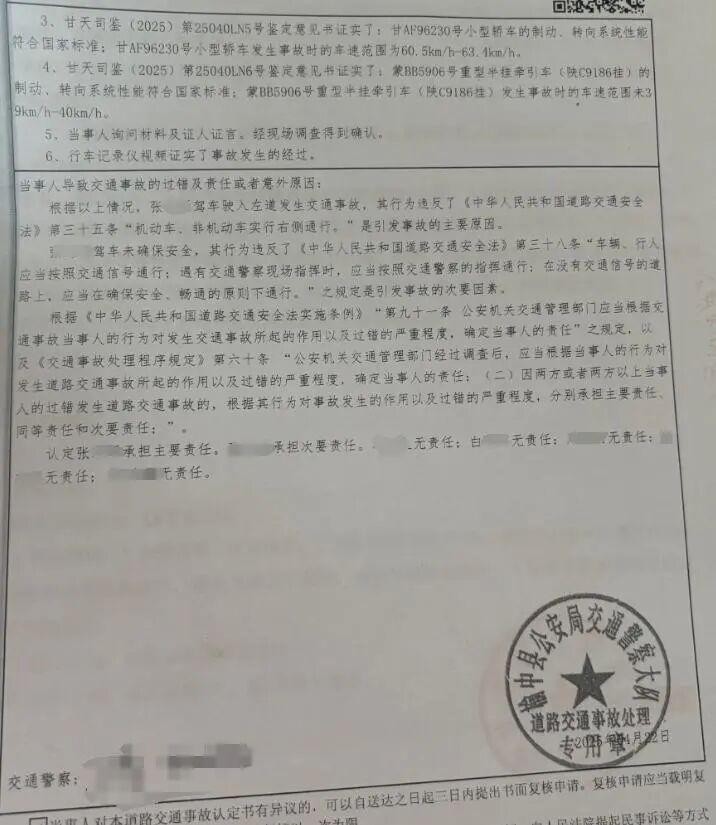 榆中县公安局交警大队出具的道路交通事故认定书白纸黑字写得清楚:张先生驾驶车辆违反《中华人民共和国道路交通安全法》右侧通行规定,驶入对向车道引发事故,承担事故主要责任;重型半挂牵引车司机承担次要责任;白女士作为车内乘客,无任何责任。