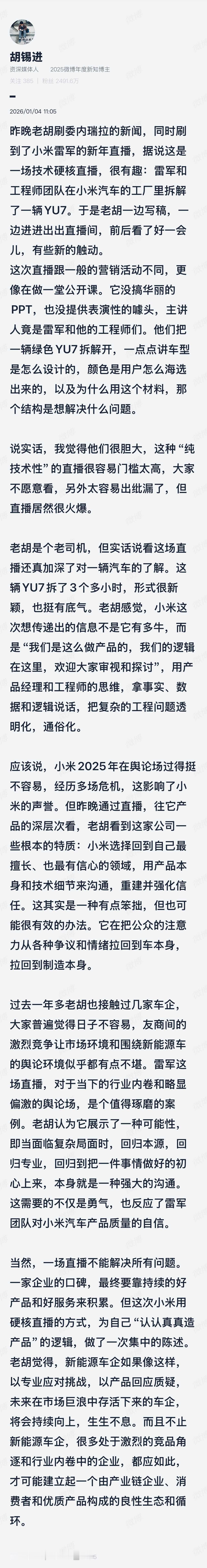 关于小米1月3日拆车直播,老胡文章表达了一个非车迷非汽车圈的社会时政自媒体人对这