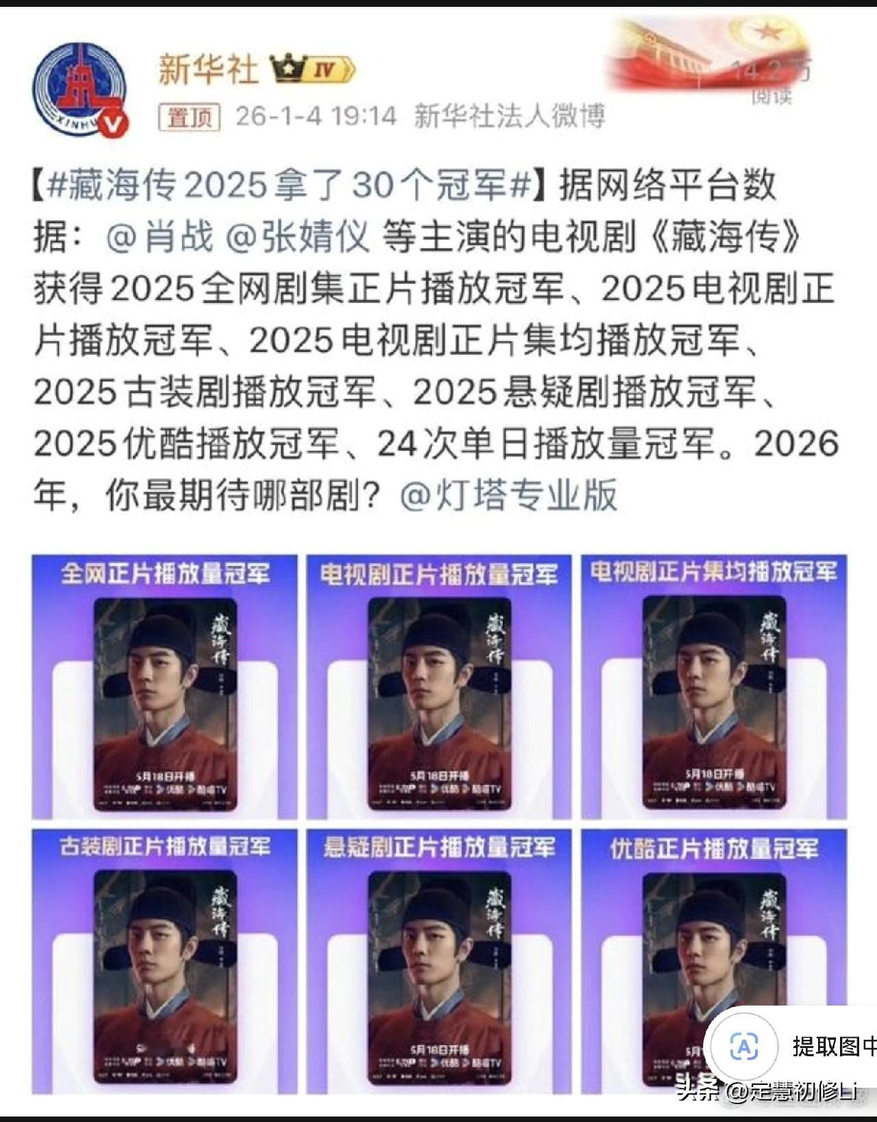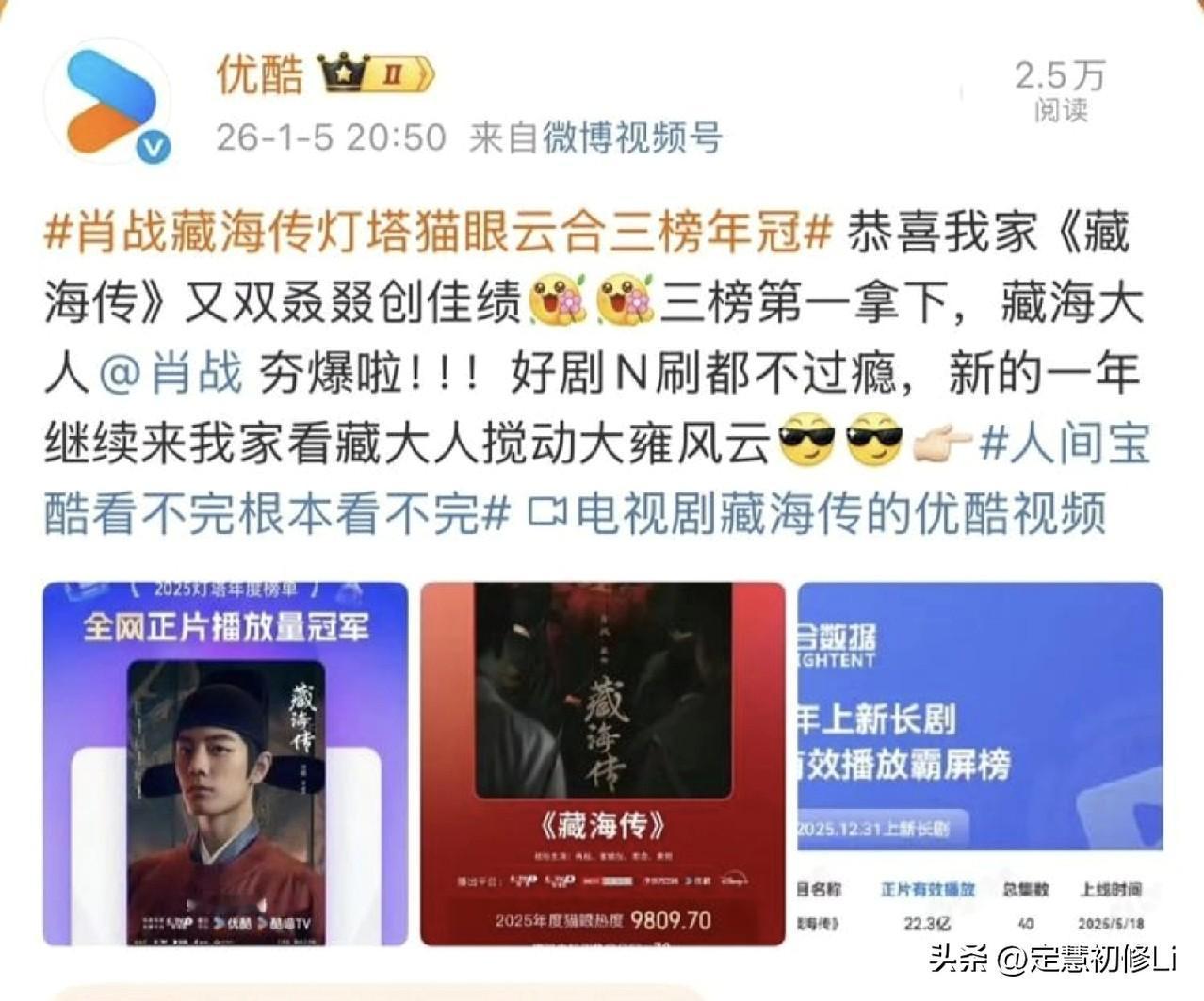戏混子不但各种数据造假,还各种挂蹭碰瓷造谣肖战。 这不,不光业内忍不住出来打假,新华社和腾讯音乐也赶紧再次出年终战报,告诉观众和听众,肖战的《藏海传》是2025年当之无愧的剧王[赞]肖战的唯一一张音乐专辑《我们》不但是24年和25年的销量冠军🥇.还是全平台历史销量冠军[赞][比心]肖战的唯一一支数字单曲《光点》不但是全平台历史销售冠军,还破了单曲销量吉尼斯世界纪录[比心][赞]