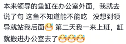 本来领导的鱼缸在办公室外面,我就说这鱼不知道能不能吃,没想到领导就站我后面,第二天我一来上班,缸就搬进办公室去了