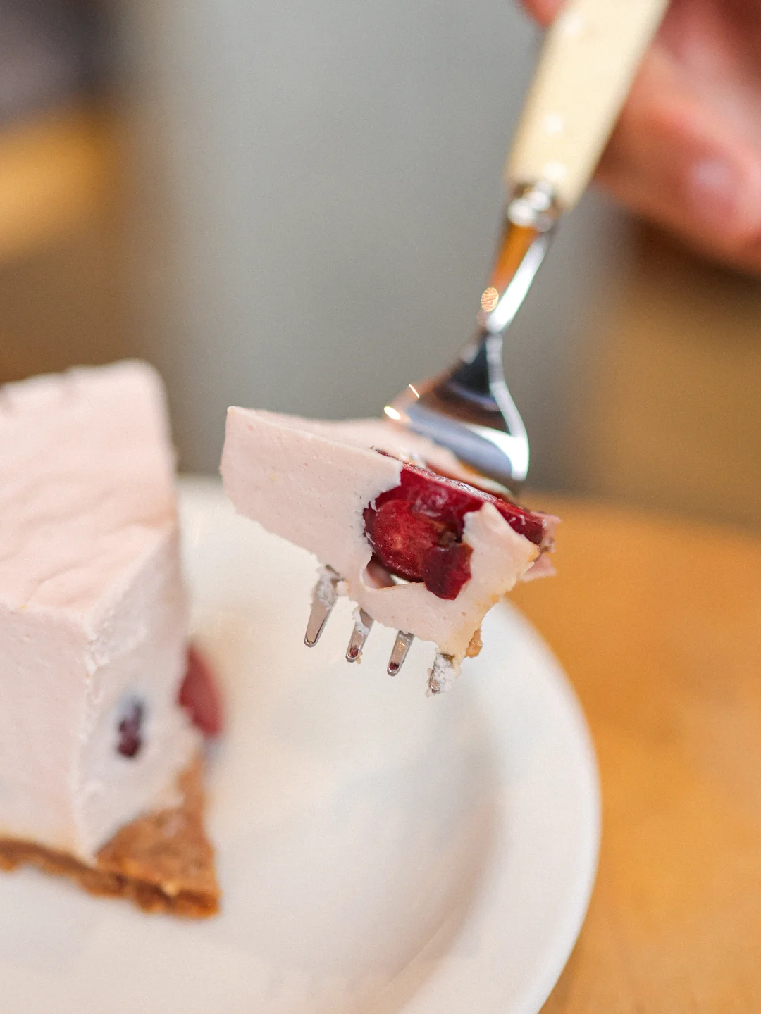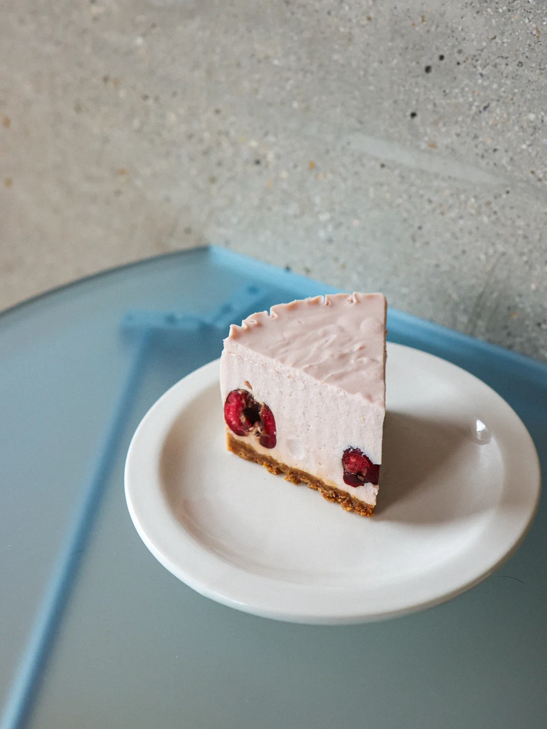 未经烘烤,靠冷藏凝固成型的切片,整体吃起来像是车厘子味的固体酸奶,入口抿开就能化开,稍微带有柠檬的微酸味,吃起来是很水果调性的清爽;咬到去核的车厘子是小惊喜,很适合搭配深烘豆。