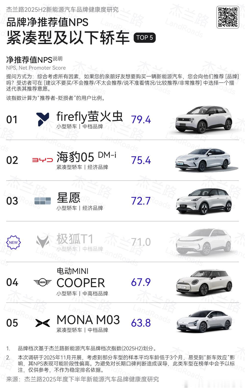 《杰兰路 2025 H2 新能源汽车品牌健康度研究》刚刚发布,firefly萤火虫凭借79.4的极高 NPS(品牌净推荐值)得分,排在前面前三,说明萤火虫的品牌价值已经得到了广泛认可车型方面,在“紧凑型及以下轿车”榜单中,firefly萤火虫领先电动MINI等热门车型,获得该细分市场榜首,成为当下市场用户最愿意推荐的高端精品小车车卖的多,用户还满意,还愿意推荐,品牌还建设的好……到现在为止,应该没人再质疑萤火虫的含金量了吧?汽场全开