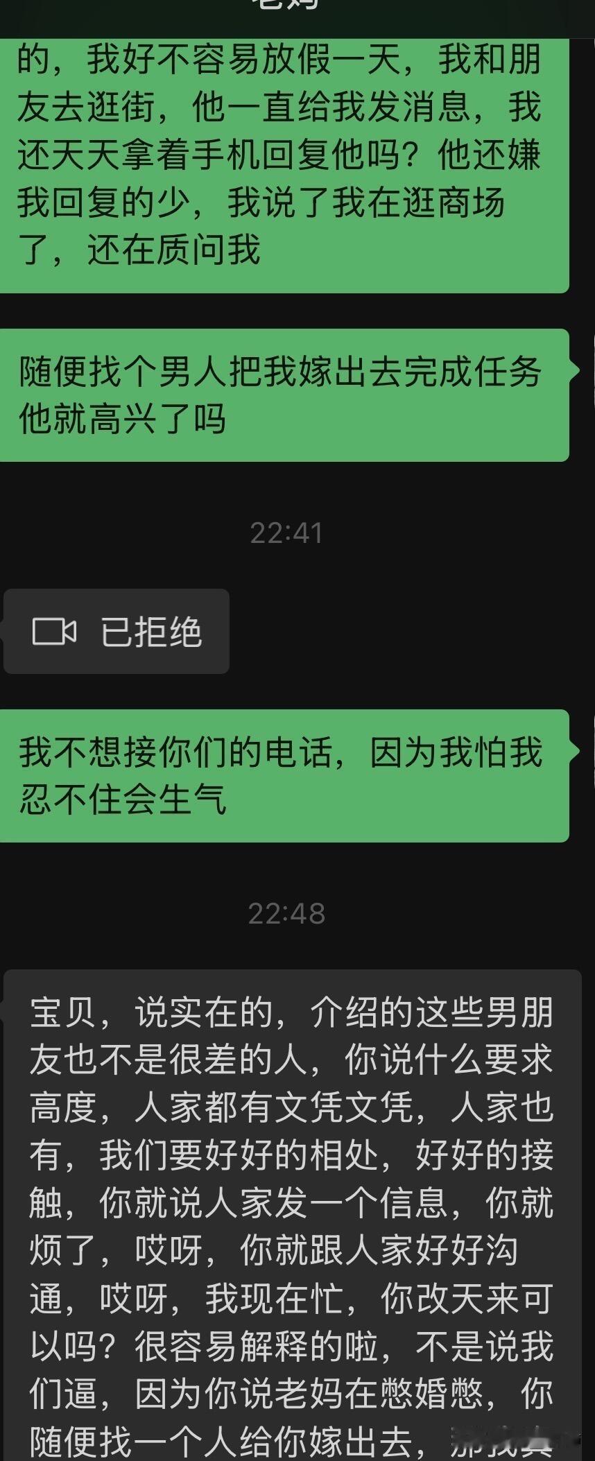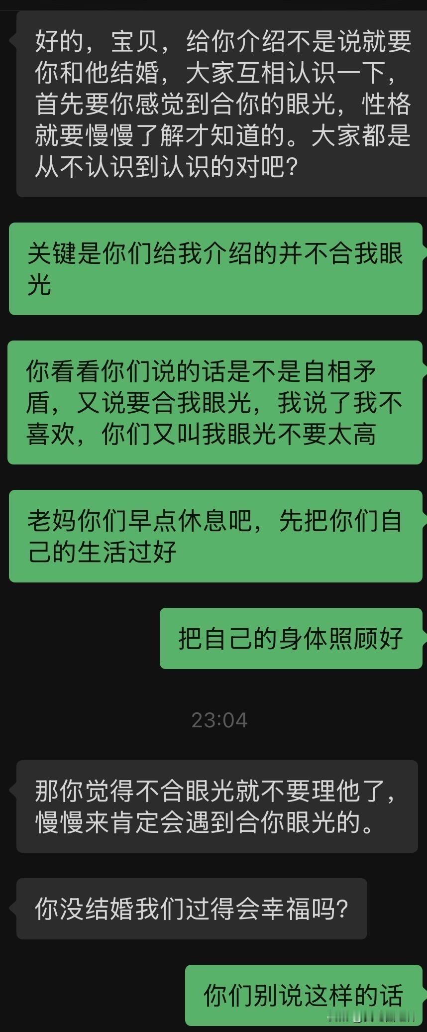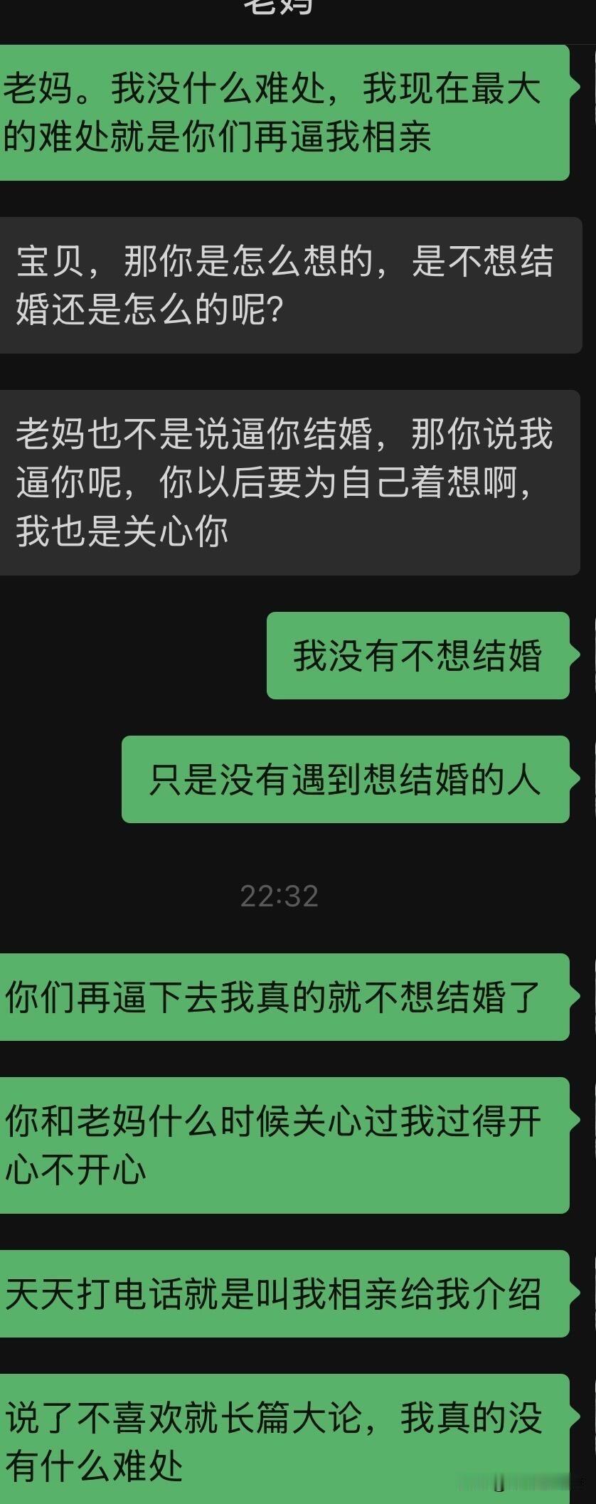 关于相亲这件事 我自己过得挺好的,我不是恐婚,也不是不结婚,生理心理都没有阴影,真的只是没有遇到喜欢的并且我很享受现在的状态。天天电话微信老爸老妈跟我说的所有话都是相亲结婚。我真的快碎了,已经不知道该怎么办了