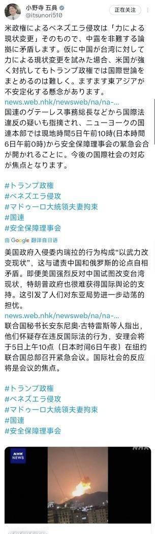 全是算计!日本自民党安全保障调查会长小野寺五典在X平台发帖指出,美国对委内瑞拉的