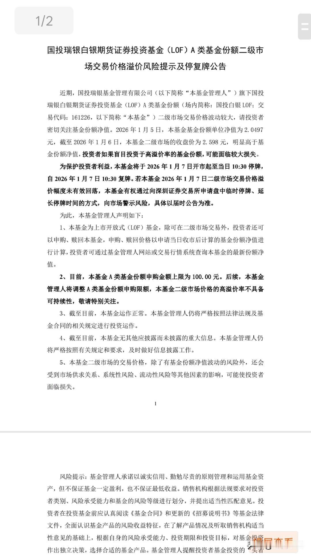 大家都在吹泡沫,为什么就盯着白银ETF不放? 国投LOF基金明天又双叒叕被停牌一小时了,这不知道被停牌一小时多少次了。 今天它刚才大涨9%,晚上就被安排上了。 它有没有风险,肯定有,但是相比于去年12月底的泡沫,已经小很多了。它最高峰时溢价达到50%以上,今天收盘溢价率也就22%。 它相比较于现在的市场那些被疯炒得重组股、无脑概念炒股,溢价风险就真得大到天天被盯着吗? 既然大家都在吹泡沫,那么也就没必要区别对待了。
