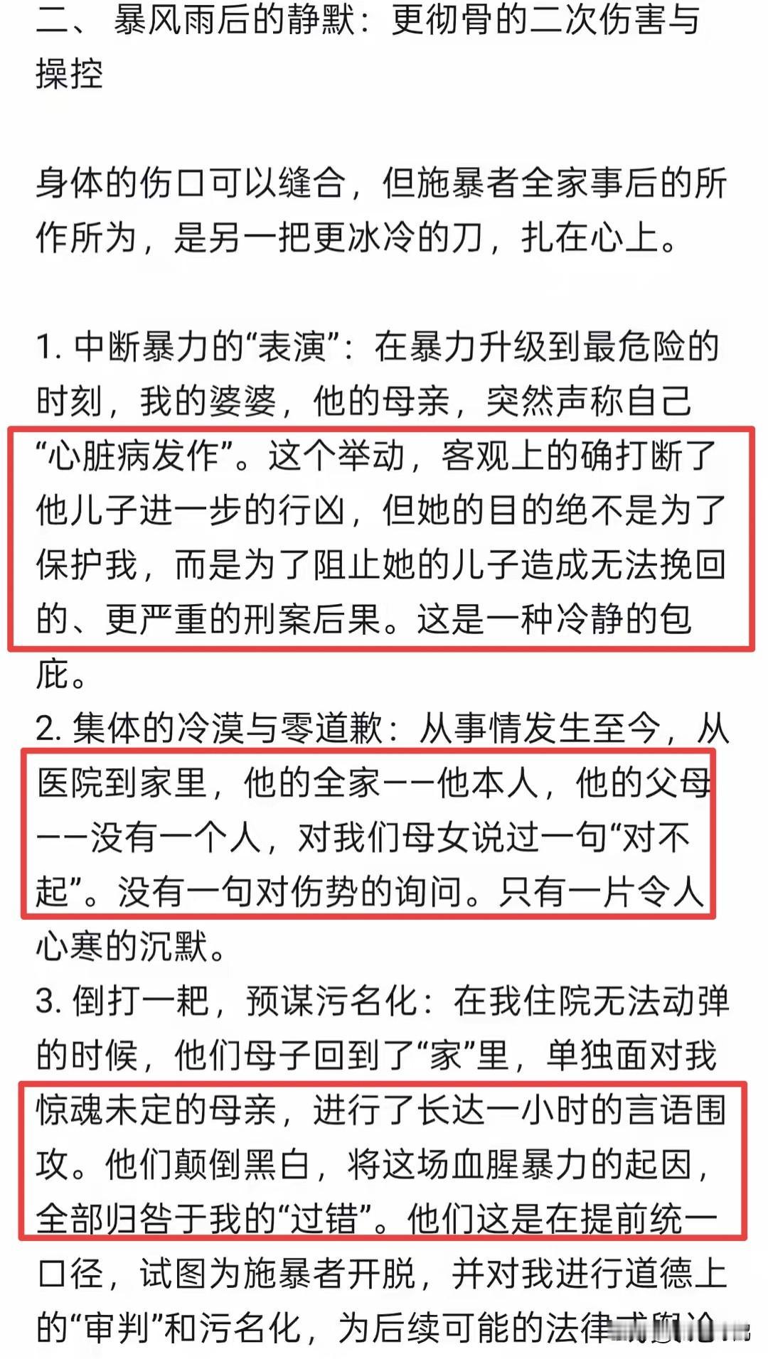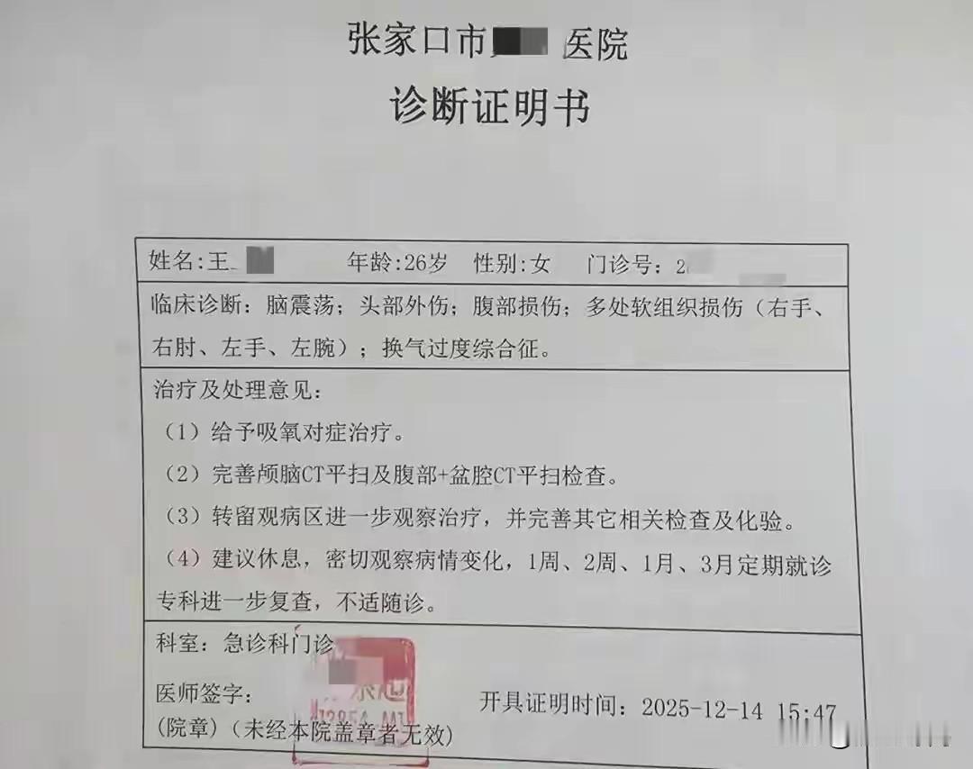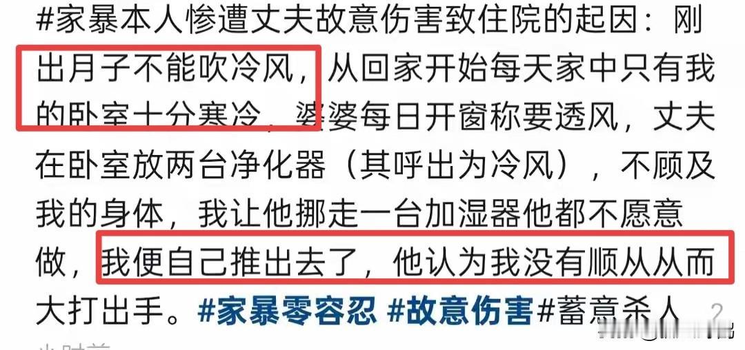 女子产后被家暴后续: 男子身份曝光有案底,婆婆包庇,当事人曝更多内幕。 1月5日,受害人(王女士)曝光一段监控视频称: 产子55后被丈夫家暴,挥拳击打,拖拽,持刀威胁。 被殴打的原因是让他挪走一台加湿器,他都不愿意做,于是王女士自己去挪,结果其丈夫看到后,将她拖到餐桌旁,抡起拳头,连续4拳砸在王女士头上。 其实,看完王女士发的长文,这件事导火线还是婆婆这边,因为卧室里有两台加湿器都打开了,吹着还是冷风,而她婆婆还将窗户打开通风,要知道河北张家口冬天都是零下几度,而王女士刚出月子不能吹冷风这是常识,要求关窗和挪走加湿器都不愿意,于是女子自己去挪,也因此被丈夫殴打,其婆婆还坐在一旁无动于衷,并没有上前去阻拦。 王女士说: 在暴力升级到最危险的时刻,她婆婆才上前声称“心脏病发作”躺在地上,这个举动确实打断了丈夫家暴,但不是为了保护她,而是为了阻止她的儿子造成无法挽回的、更严重的刑案后果。这是一种冷静的包庇。 其中一个细节更令人细思极恐,王女士被丈夫家暴时,她的婆婆在客厅看了一会儿就回到房间了,而王女士的母亲听到动静后迅速跑出来阻拦女婿殴打女儿,为了保护女儿,将女儿紧紧抱在怀里,老人也因此被女婿打了几拳。 这个时候,婆婆才不紧不慢的从房间里找出来,上前去拉扯儿子后假装“心脏病发作”顺势躺在地上,这场家暴才停止。 王女士趁机跑了出去,躺在地上打电话报警以及120。事后更令人气愤,王女士被打:脑震荡、头部外伤、腹部损伤、多处软组织挫伤,还有因过度惊吓导致的“换气过度综合症”。躺在医院不能动弹时,而她的丈夫和婆婆却在家里对她母亲长达一小时言语攻击,他们颠倒黑白,全部归咎于王女士的“过错”。 事发至今为止,王女士都没有收到丈夫和婆婆的道歉,哪怕一句伤势询问都没有。目前,王女士已经带着受伤的母亲回到自己的家里,坚决提出离婚。 而家暴男却认为这只是普通的家庭矛盾,过一阵就会和好,并拒绝离婚。 其中值得一提的是,这个男的身份是一家公司老板,王女士2024年经人介绍认识的,还到男的公司帮忙,怀孕后两人才领取结婚证,在2025年10月16日生下一个儿子,于12月10日被家暴。 目前,警方已行政立案,当地妇联已介入,提供了法律援助和心理疏导。 有网友说: “妹子,你可一定要清醒,要坚持住,产子才55天就能对你动手,只有0次和无限次,珍爱生命果断离婚!” 对于此事,你怎么看?