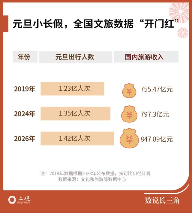 对比2024年同为3天的元旦小长假,2026年无论是出游人次、还是旅游收入,均胜出一个身位。文旅部门数据显示,今年元旦,全国出行人数对比2024年同期增长5.2%,国内旅游收入增长6.3%。