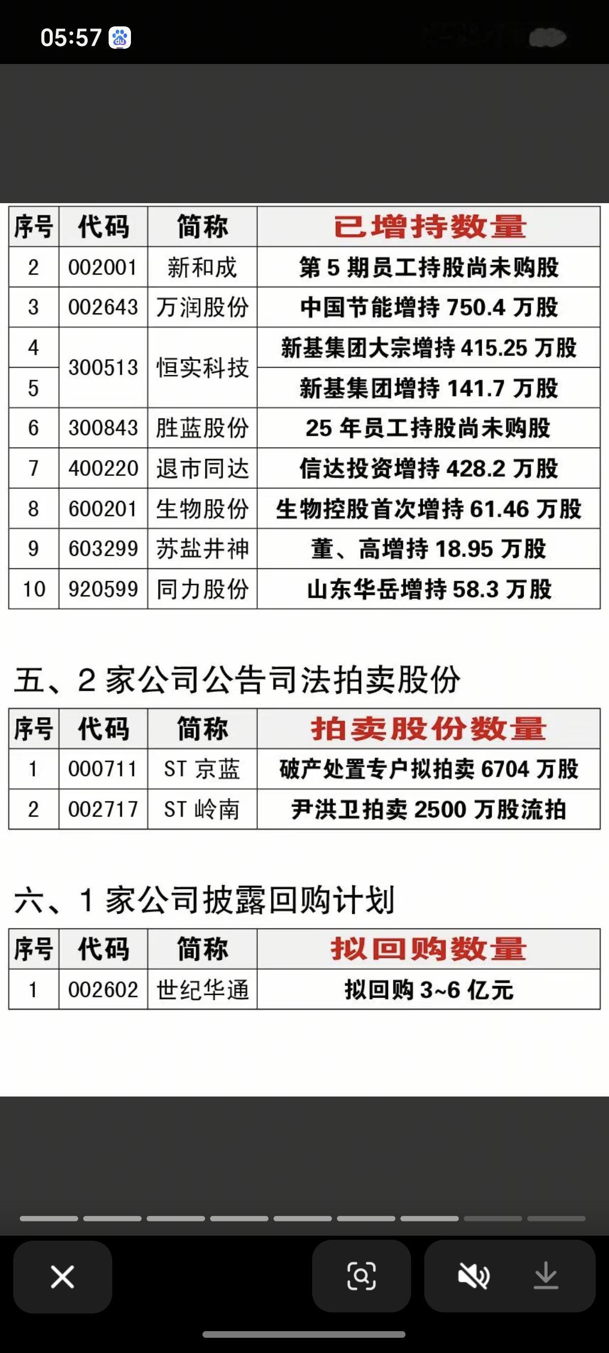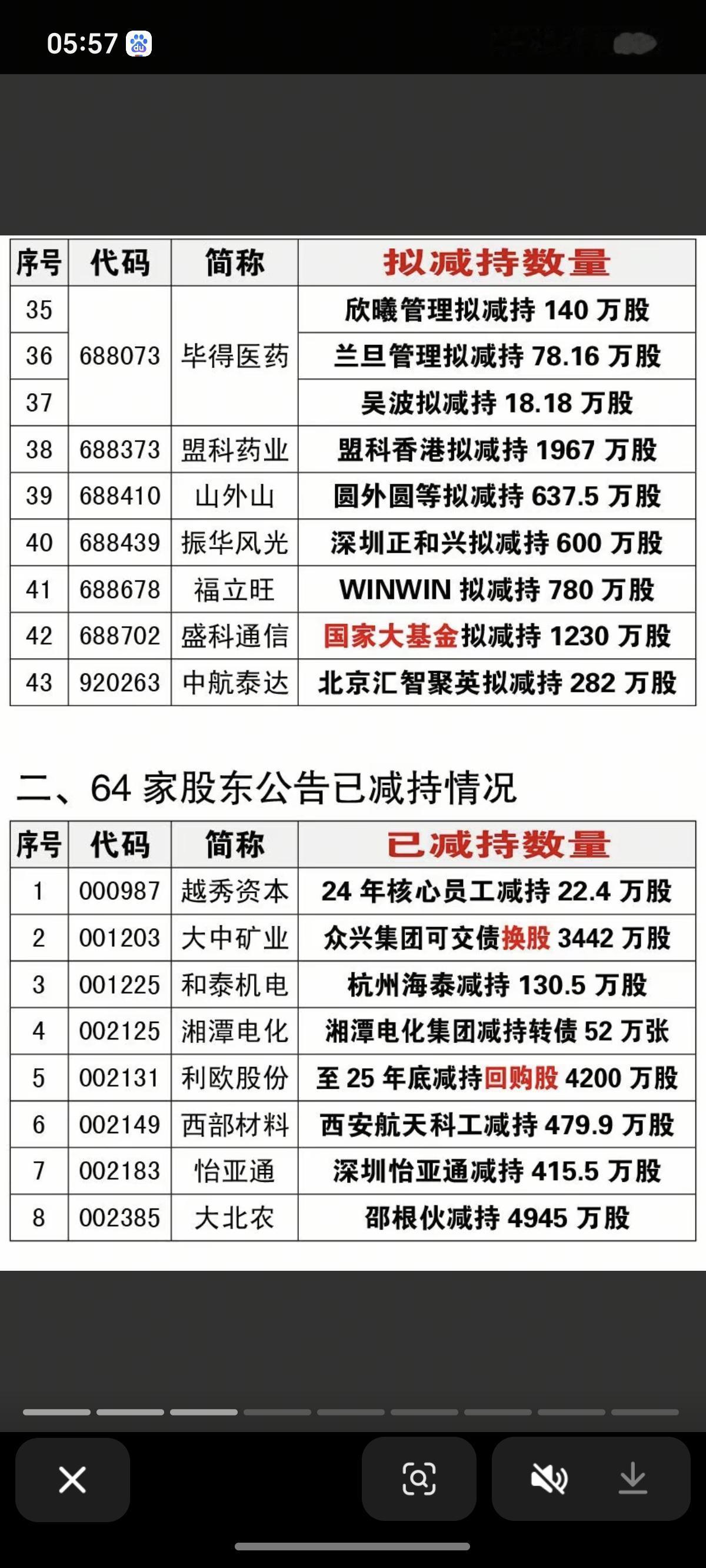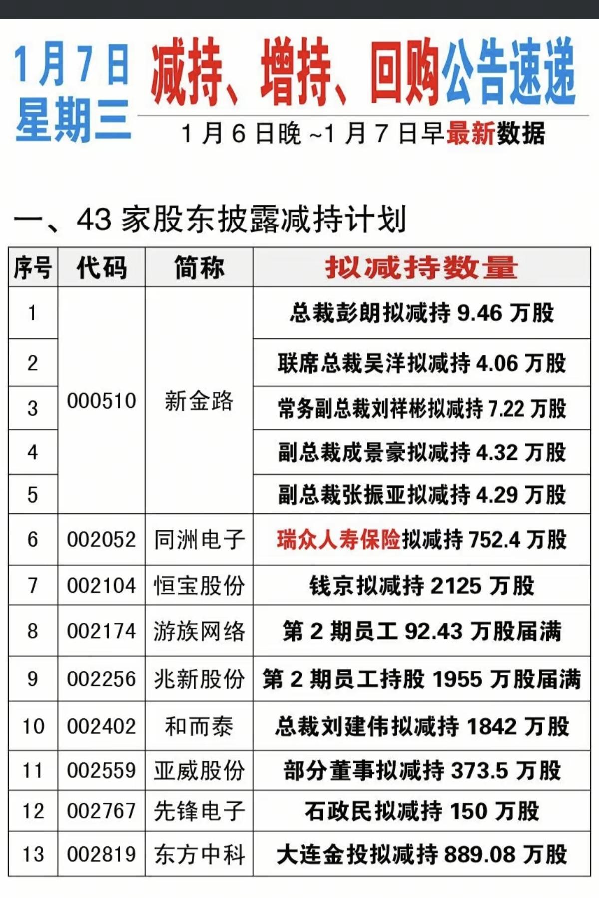 1.7周三 最新:减持、增持、回购公告! 43家股东减持计划,2家公司法拍股份,3家有关回购,3家公告注销回购股份