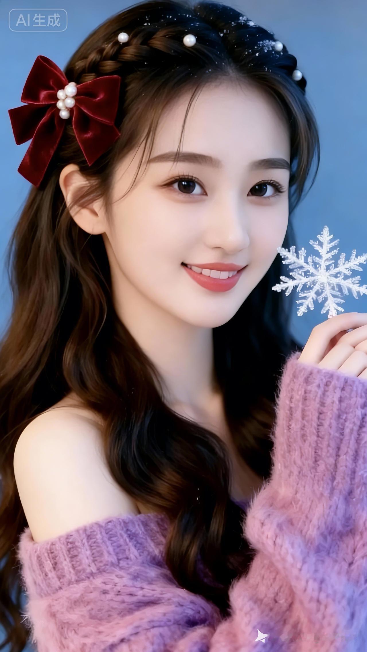 侧影女孩梳层次底发髻,碎发飘颊,五官精致笑容明媚。黑上衣配酒红丝绒蝴蝶结围巾,耳