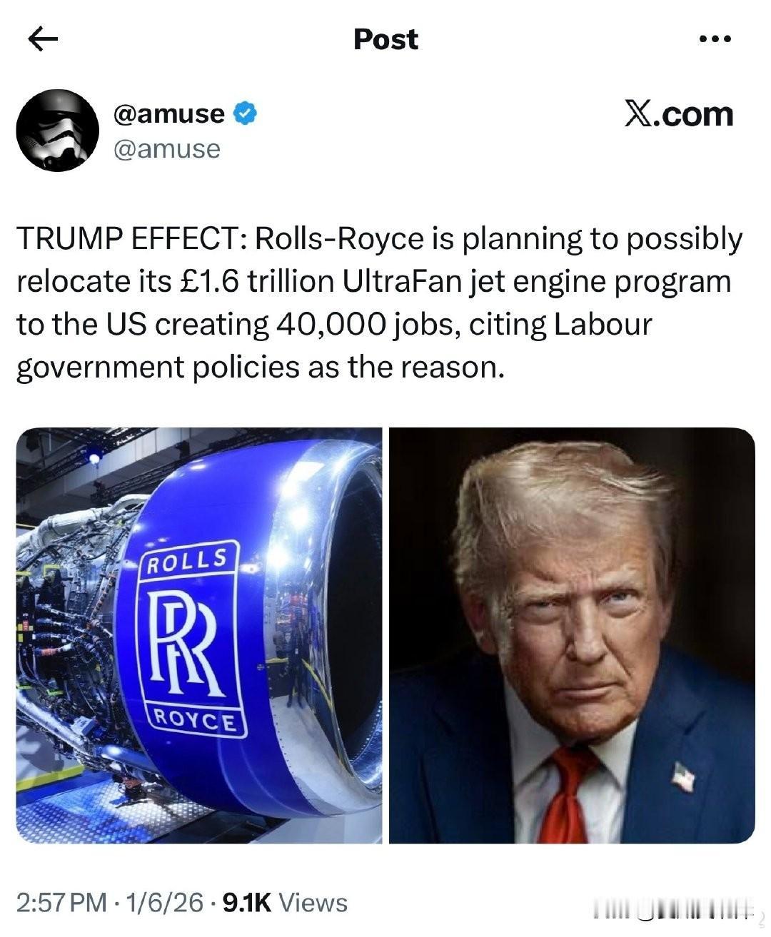 川普效应:劳斯莱斯正考虑将其价值1.6万亿英镑的UltraFan喷气发动机项目迁至美国,此举可创造4万个就业岗位;公司把原因归咎于工党政府的政策。