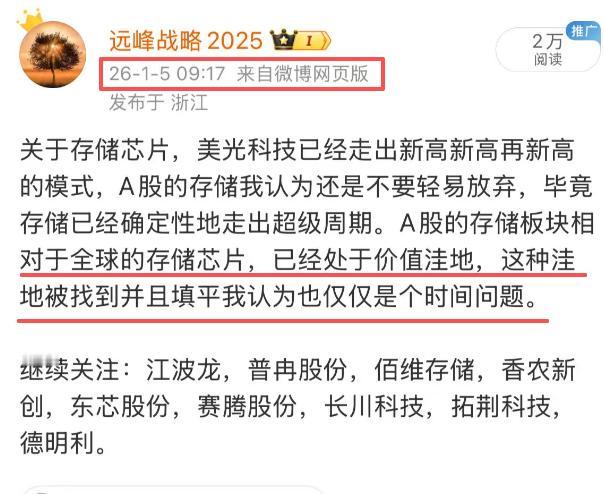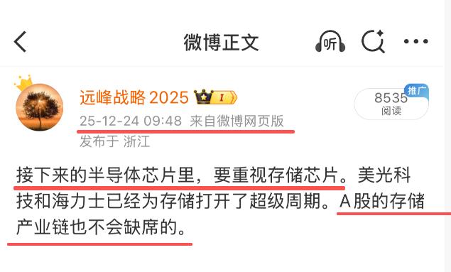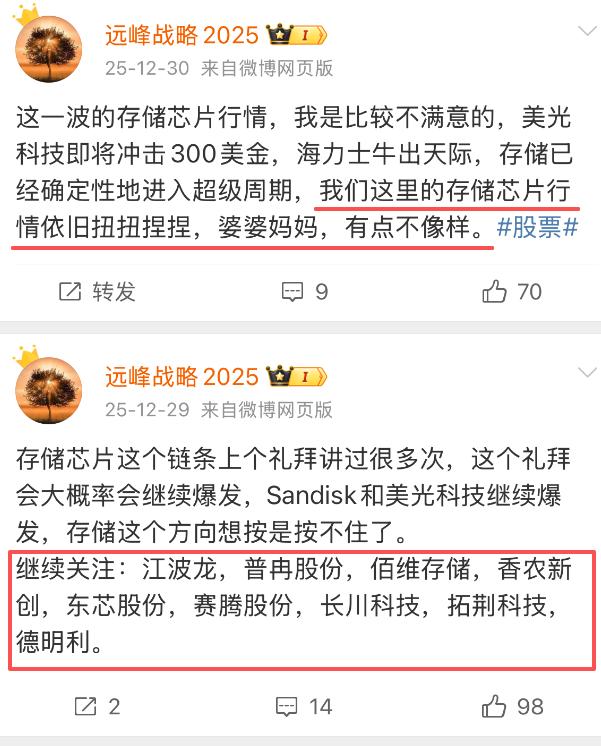 存储芯片这几个字在我最近20天的文章里重复次数是比较多的。近段时间以来我反复地说,存储芯片已经进入了超级周期,应该予以足够的重视,存储芯片是芯片行业的第二大产业,仅次于CPU、GPU等逻辑芯片,过去一年多美光科技率先掀起存储芯片涨价潮,不断宣布对DRAM和NAND产品上调价格。目前中国的存储芯片我一直说还处于全球存储的价值洼地。 隔夜,美光科技涨幅涨幅超过10%,闪迪涨幅27%,西部数据涨幅16.77%,希捷科技涨幅14%,均创历史新高。A股的存储就算再不济,我认为也是压不住的。 继续关注并跟踪存储相关公司:普冉股份,江波龙,兆易创新,长川科技,雅克科技,深科技,佰维存储,香农新创,东芯股份,赛腾股份,德名利等。