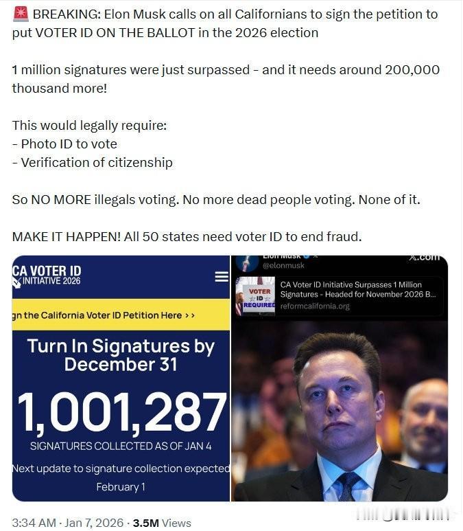 突发:马斯克呼吁所有加州居民签署请愿书,把“选民身份证”列入2026年选举选票。 目前已突破100万个签名——还需约20万个! 若通过,将依法要求: - 投票须出示带照片身份证 - 核验公民身份 从此杜绝非法移民投票,杜绝死人投票,统统杜绝。 干起来!全美50州都需要选民身份证,终结舞弊。