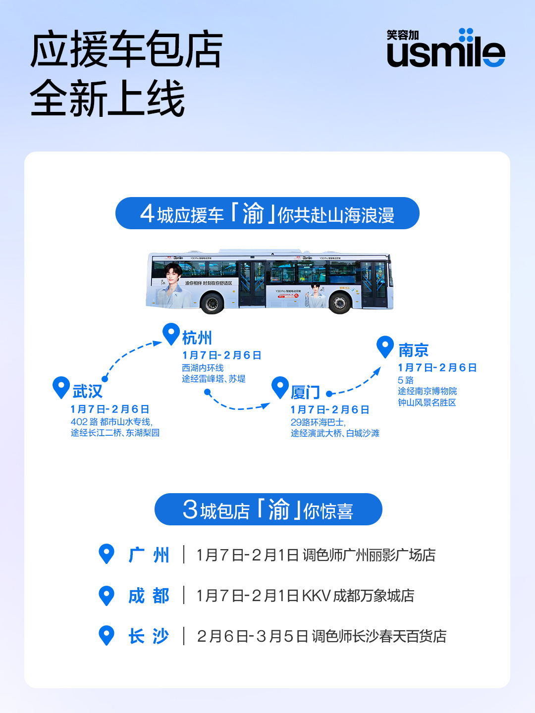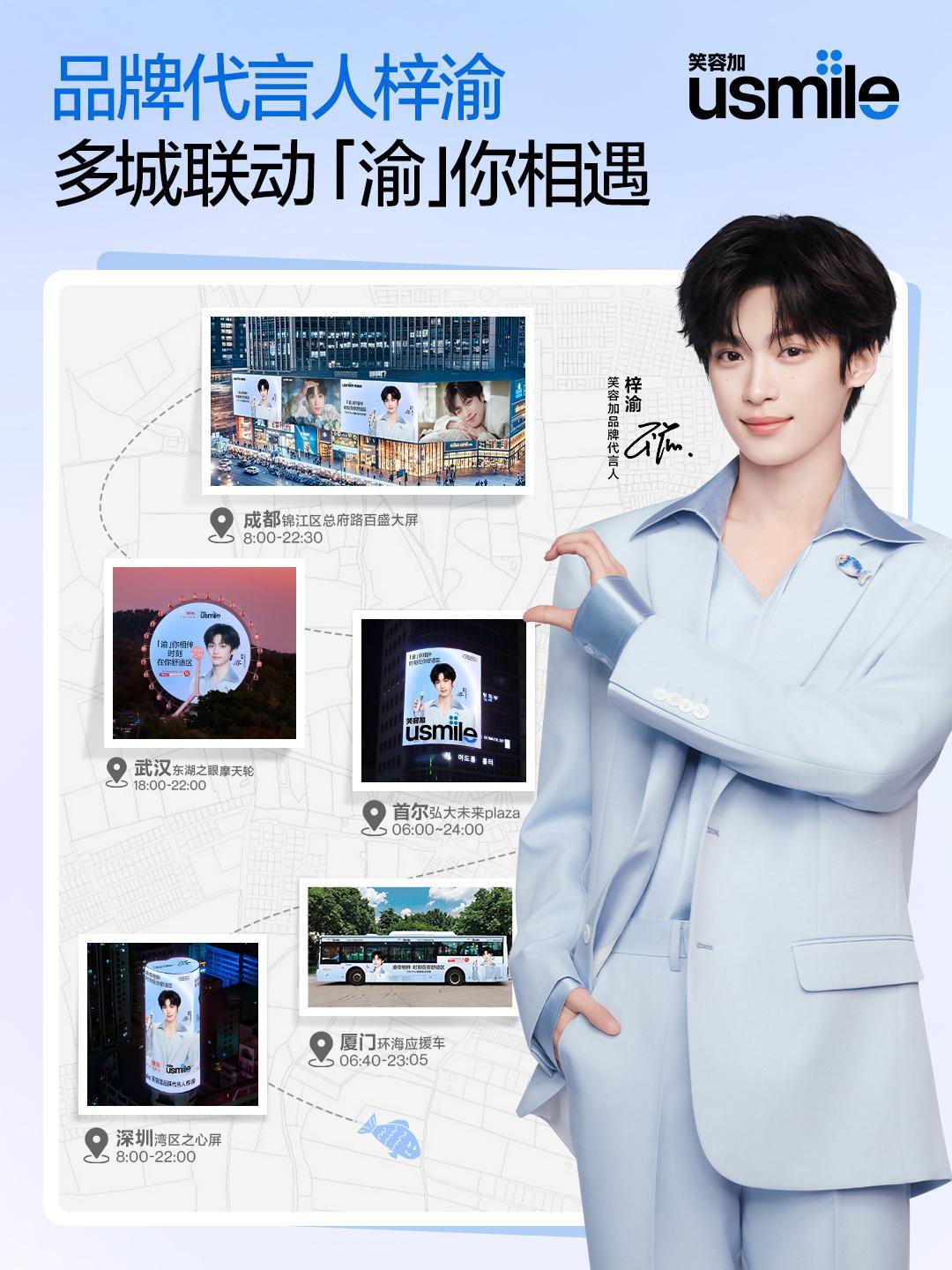 usmile笑容加品牌代言人梓渝梓渝usmile线下大屏投放解锁,45块大屏,还有4城应援车,3城包店,排面拉满了!
