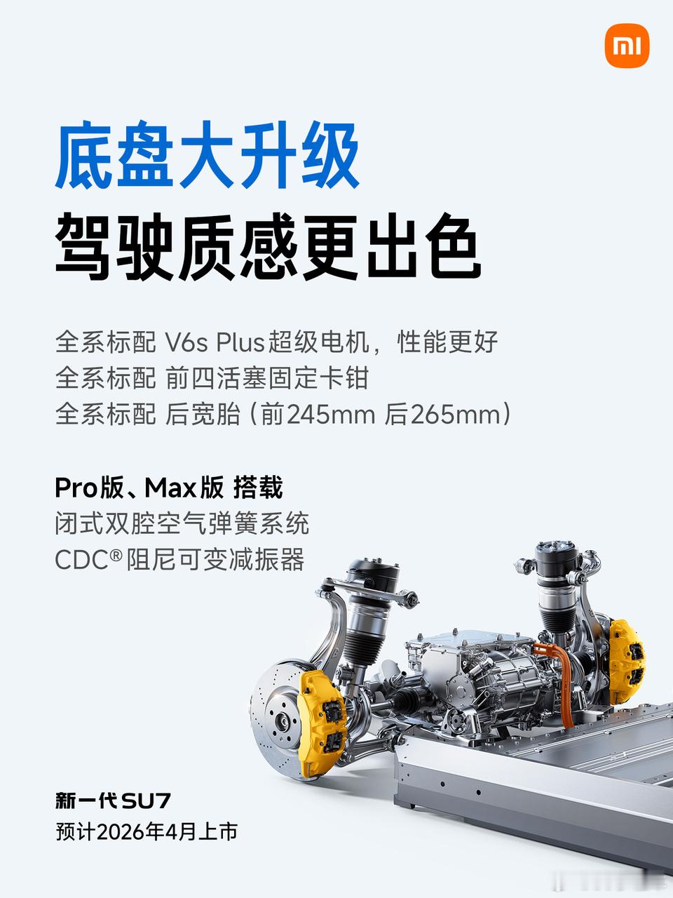 小米汽车正式发布新一代小米SU7官图。新车于今日开启小订,预售价22.99万起,预计2026年4月上市。新车全系标配激光雷达,提供700TOPS算力,支持高阶城市NOA功能,覆盖车位到车位全场景辅助驾驶。外观方面,新车整体造型轮廓与现款保持一致,把隐藏式门把手改为了半隐藏式,提供全新卡布里蓝车身配色和新造型20英寸铝合金轮圈(现款为19英寸轮圈)。新车还全系标配前245mm、后265mm宽度的轮胎(现款前后胎宽度均为245mm)。动力续航方面,新车全系升级为800V平台(现款中低配为400V平台),CLTC续航里程提升到了最高902km(现款最高820公里),Max版15分钟最快补能670km。此外,新车Pro/Max版标配双腔空气悬架+CDC。小米SU7