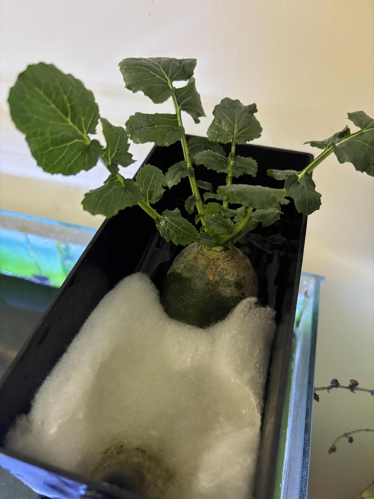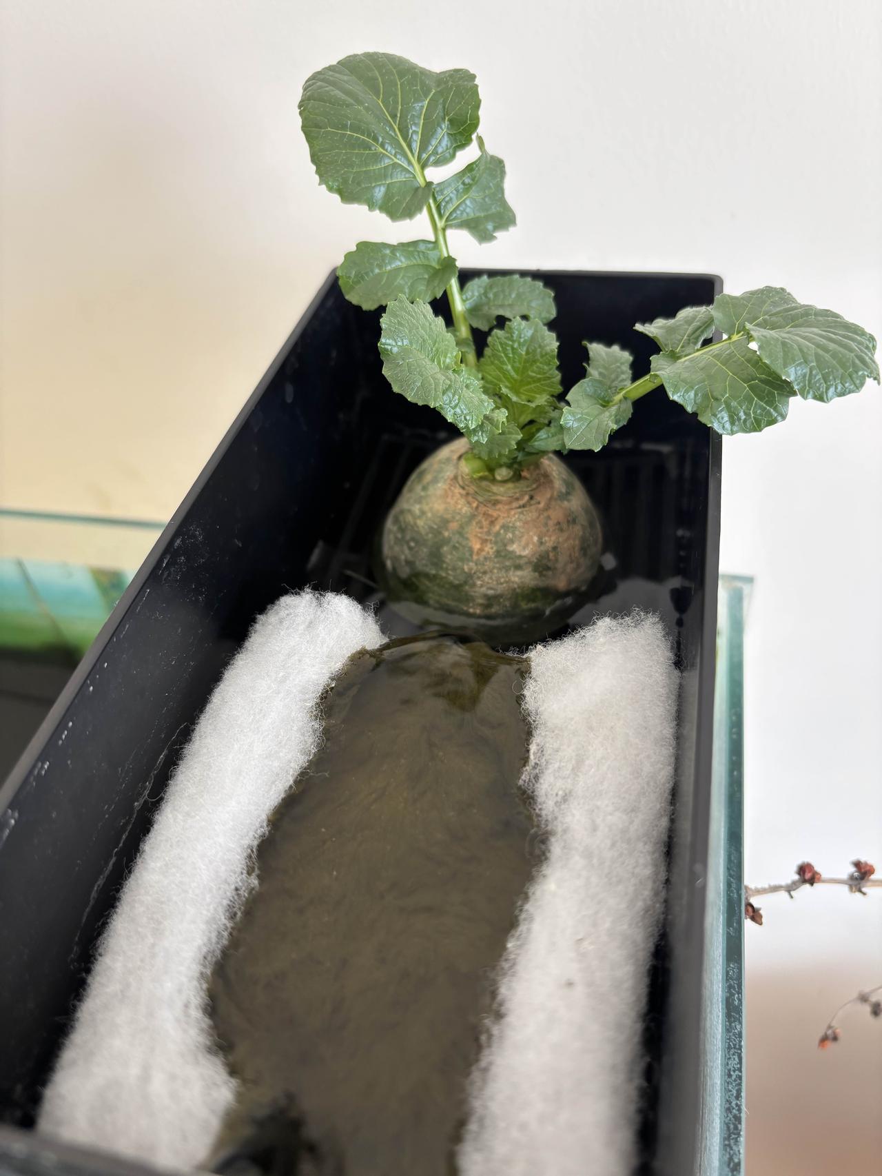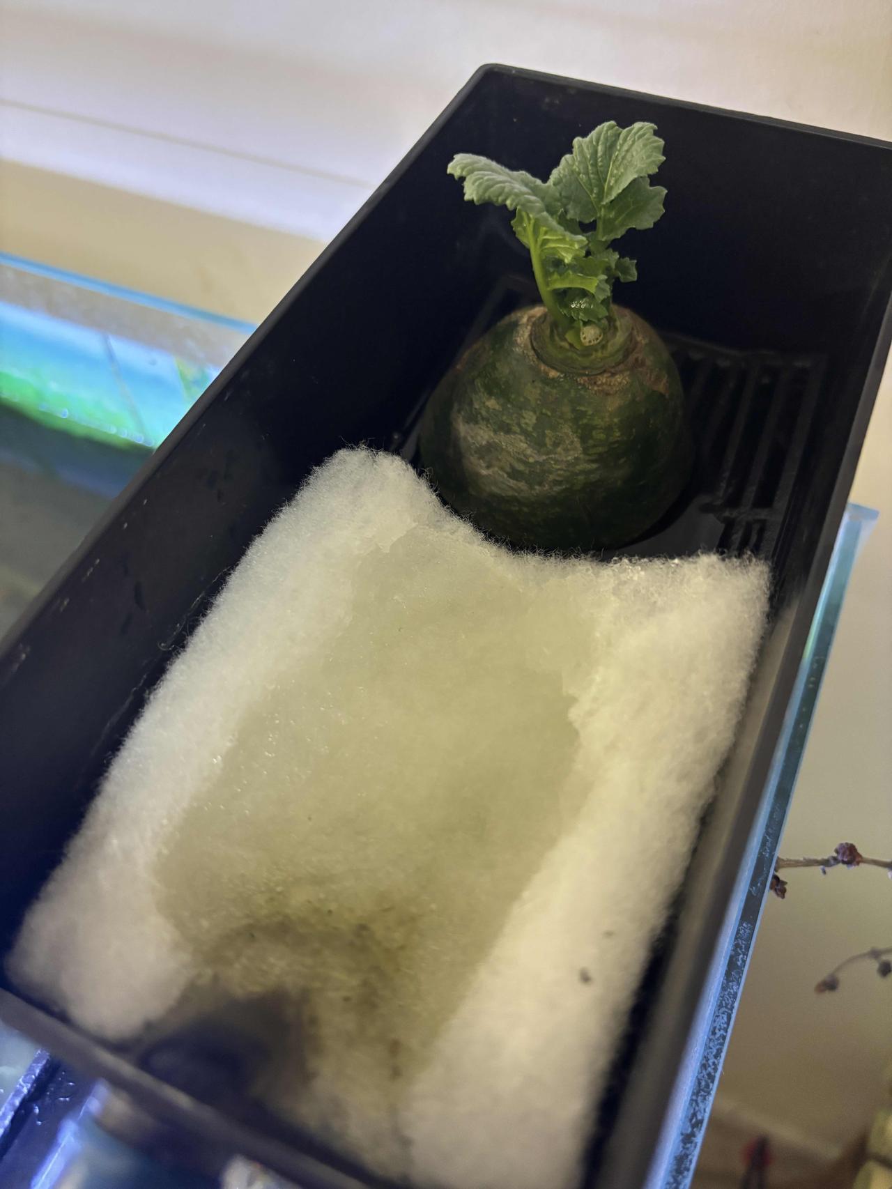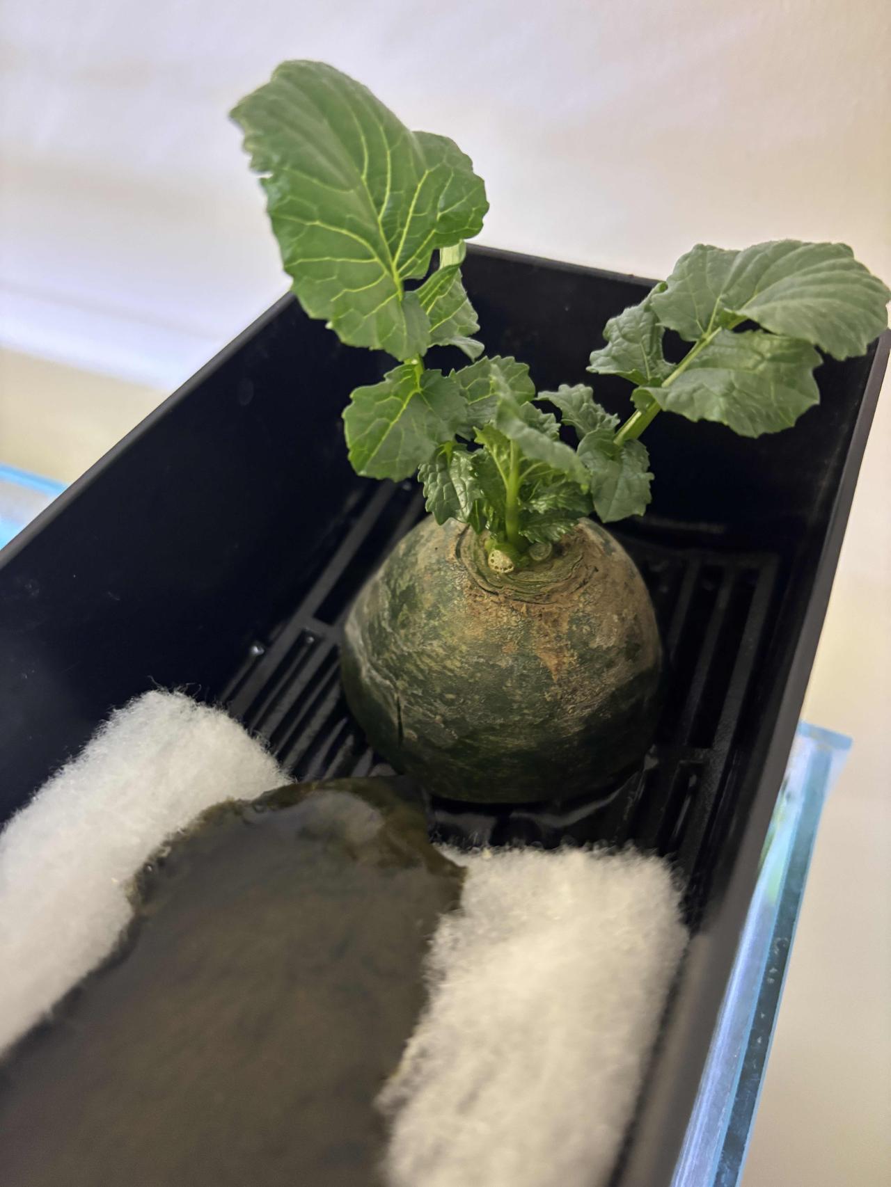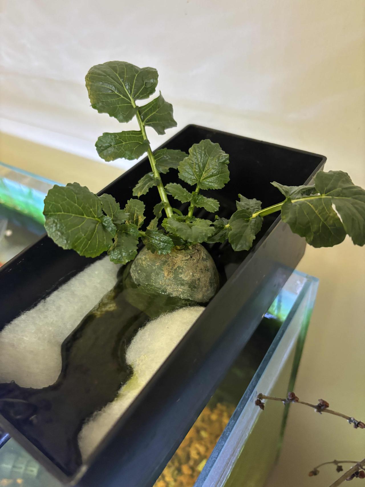 前几天闲着没事,我把小萝卜头放鱼缸过滤器里养着,现在已经过去21天啦,变化还挺明显。 一开始把它放进去,就盼着它能有点动静。大概一个星期,小萝卜头就开始发芽了,嫩绿嫩绿的小芽冒出来,看着特别有生机。又过了一个星期,叶片变得壮实,还更茂密了。到现在,已经长出浓密的白根,在水里飘着。 听说这小萝卜头还能开出萝卜花,我可太期待了。想象着那粉嫩的小花点缀在绿叶间,肯定美极了。感觉自己像个小农夫,见证着生命的奇妙变化。