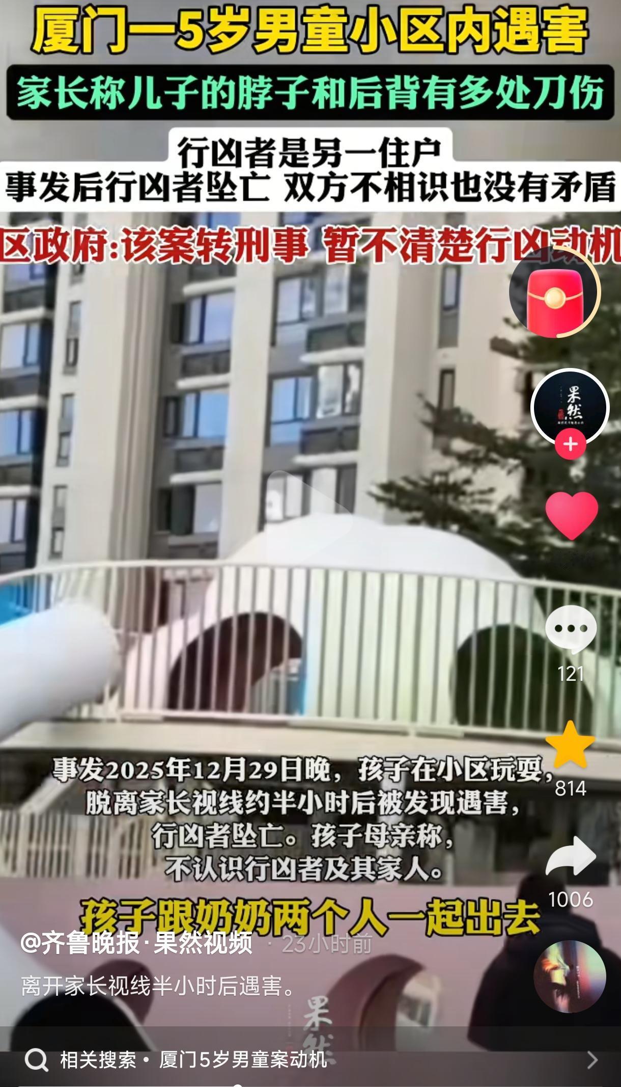 实在不明白,厦门同安59岁老妇为何会对同小区5岁男童痛下毒手?对方还是毫无反抗能力的五岁幼童,啥也不懂啊,人生还没开始,就已经结束了,真是太令人意难平了! 2025年12月29日晚,这名男童在奶奶的陪伴下到小区的游乐区玩耍,按说这是再正常不过的一次玩耍了,没想到危险正悄然逼近。 男童玩耍时刚刚脱离奶奶视线仅半小时,就遭遇了天大的不测:脖子、背上多处刀伤,等等。与此同时,59岁嫌疑人同小区住户张某作案后也畏罪坠楼自杀了。 S害了幼童,意识到自己难逃法网,故而坠亡。 这下死无对证了,估计没有人能完全弄清楚这位59岁老妇对五岁孩童痛下毒手的真实动机了。 受害男童的家属表示与行凶老太并不识识也无矛盾,不知对方为何会S害自家孩子。但知Q者又称两家曾经因为一些纠纷发生过争吵,还有说受害男童与嫌疑人孙女在同一所幼儿园就读,等等,真实情况怎样仍不得而知,得等警方调查后才知晓。 其实不管两家之间存没存在过矛盾,都不应该对一个毫无反抗能力的5岁孩童痛下杀手,再说自己也是一个当奶奶的人了,就没有一点点恻隐之心吗? 如果两家之间真有矛盾,那你就去找人家大人解决啊,而不应该将恶意发泄在一个手无寸铁、啥也不懂的脆弱幼童身上,这完全突破了人伦底线啊。 而无论出于怎样的动机,伤害幼童都是不可饶恕的、极端恶意之举,都应被千夫所指。而即便自己畏罪坠亡了,身后的名声也是臭名昭著,而且子孙后代也会因自己的恶行而永远抬不起头来做人,如此既害了别人,自家人也不好过,这又是何苦呢? 其实,生活中人与人之间相处难免会有这样那样的摩擦,这时就需要我们内心大度一点,宽容一点,因为但凡世间事除却生死都是小事,真没必要过于计较,否则害人害己,得不偿失! 真是太可怜受害的小男孩了,他才仅仅五岁啊,还是啥也不懂的年纪,就这样匆匆结束了短暂的一生,实在太让人痛心了。 (来源:九派新闻等)