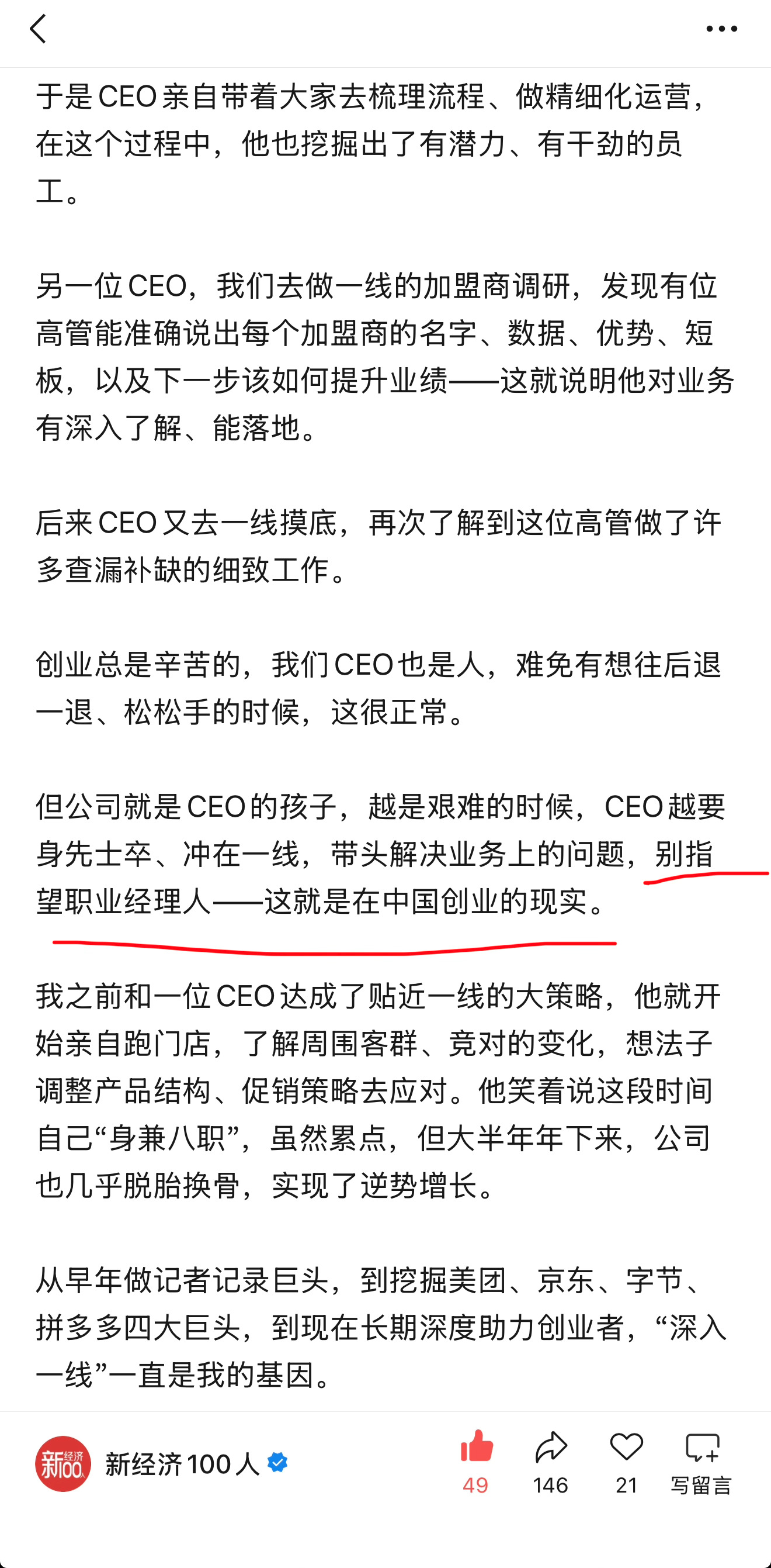 这几年跟企业打交道的过程中有同样的感悟。一是还能、还愿意深入一线的高管少之又少,更不要说CEO了。通过奋斗到达了高位,对人生自然也会有更多其他的追求,有终身奋斗这般斗志的,一定少之又少,因此还躬身于一线的CEO也显得难能可贵。二是不要迷恋职业经理人。说难听点,职业经理人不就是高级牛马、打工人,指望他们靠自驱力和信念感代替CEO领导一家公司克服困难、夺取资源、获得增长,是一种天真。普通员工身上的局限性,职业经理人身上一样有。