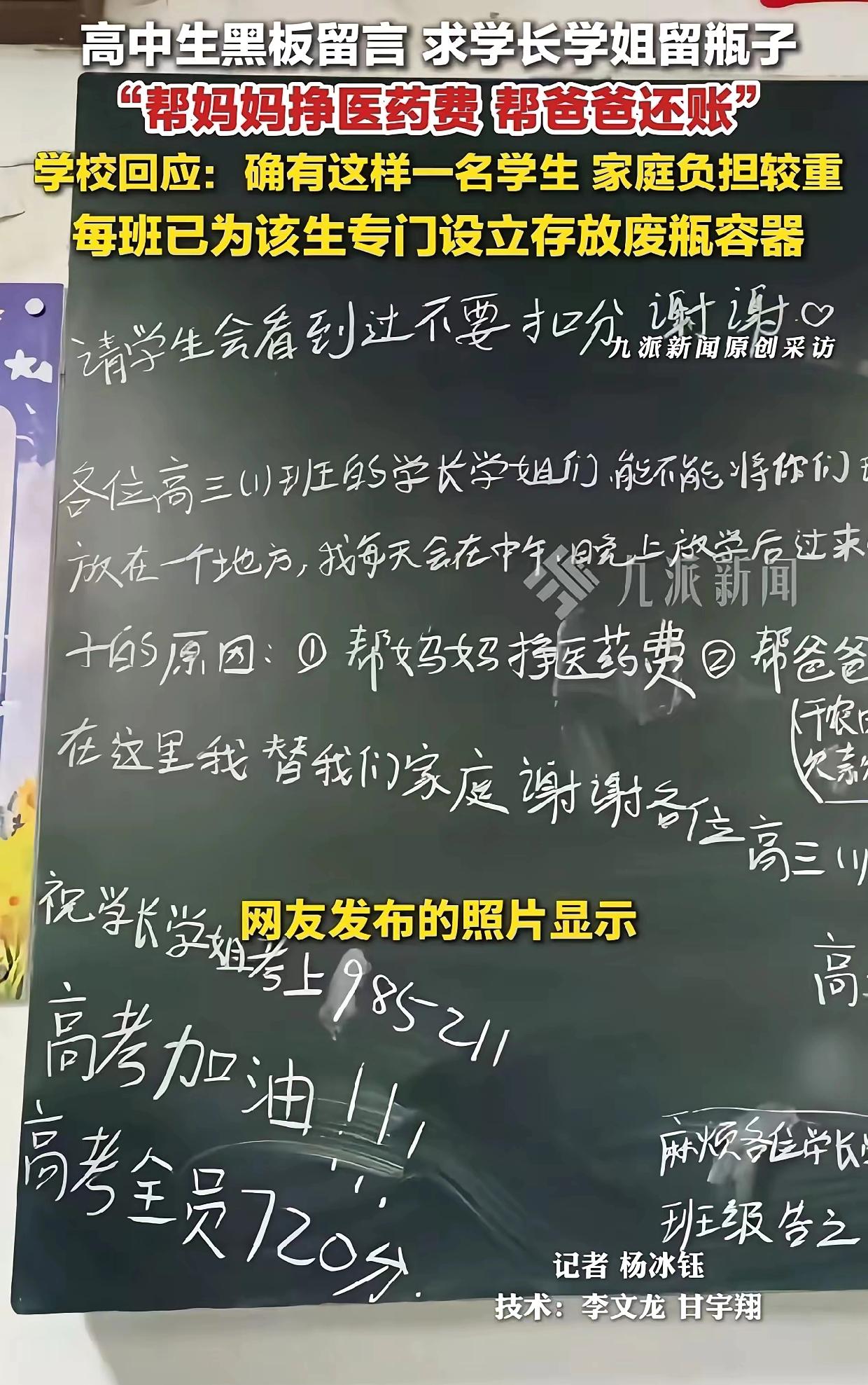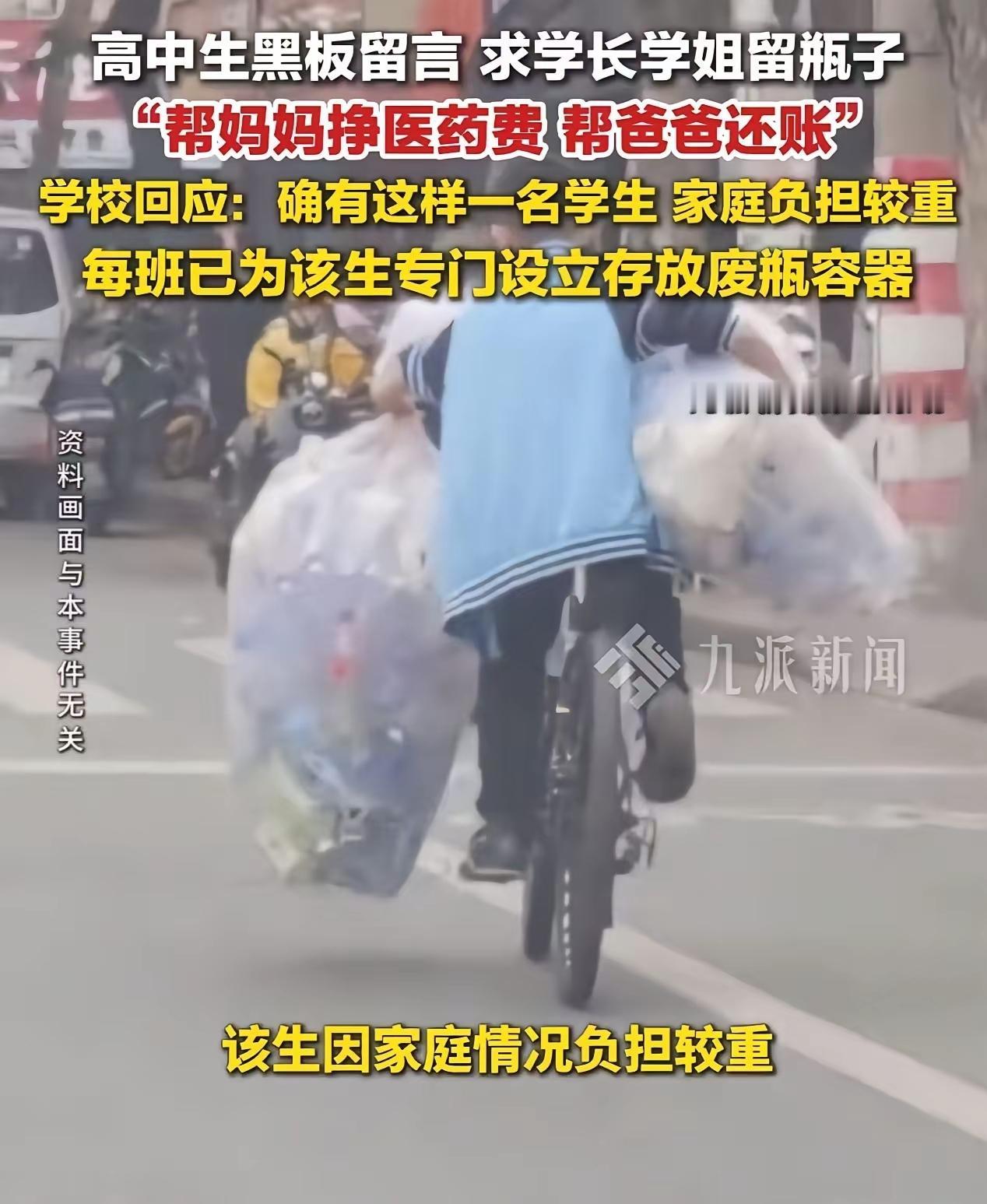 有个高二男生,家里好像挺困难,母亲生病,父亲借了很多钱,为了治病。他在学校黑板上写了字,想请大家帮帮忙,大家都在想,这到底是怎么一回事。他说,能不能把喝完的瓶子给他,他可以去卖钱,给妈妈治病。 求助方式挺特别,请学生会不要扣分,他怕影响班级,小心翼翼的,所有人看到都觉得,这孩子真不容易。 老师们知道了,很快行动起来,每个班都有放瓶子的地方,方便他收集 同学们也帮忙,把瓶子都放在一起,小小举动,温暖满满,整个学校都在帮他。 这件事后来传到网上,很多人都被感动了,大家都在讨论,这孩子的孝心,家庭的责任。 小小年纪,承担这么多,太不容易了,社会上也应该多关注这些困难家庭。很多人看完这个故事,都会去想,我们能做些什么。 希望他妈妈早点好起来,希望他家能走出困境,相信他以后会更好,以后不得了,也希望社会能多帮助那些需要帮助的人,让这个世界更温暖,更好。