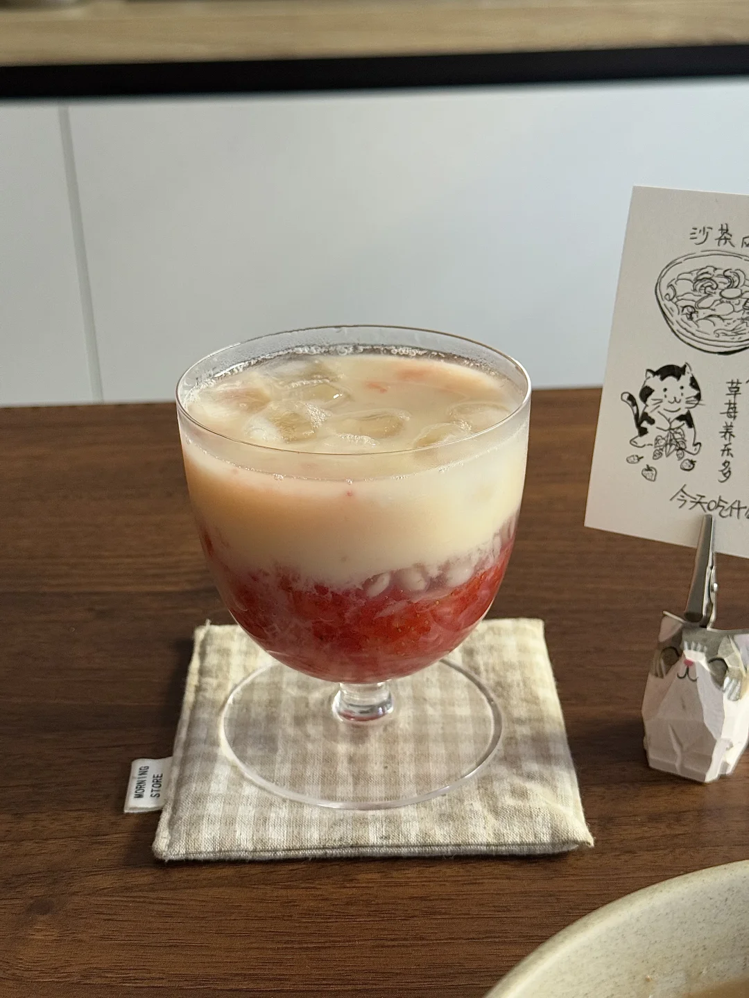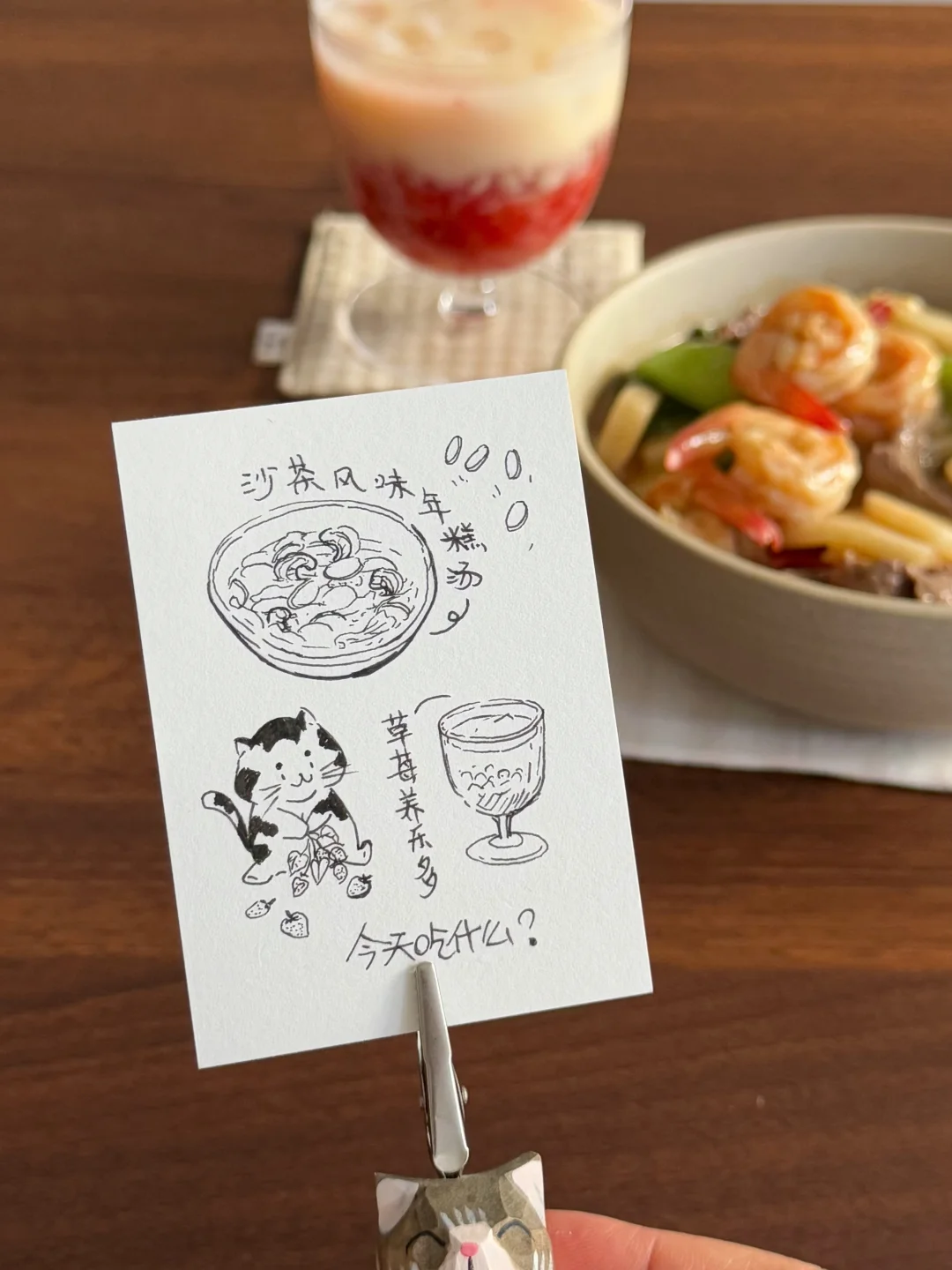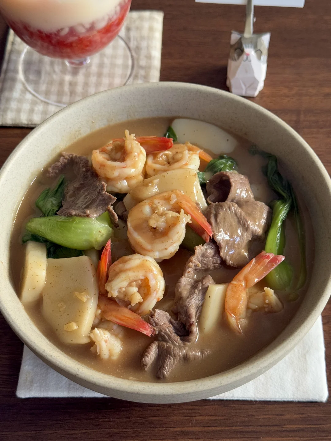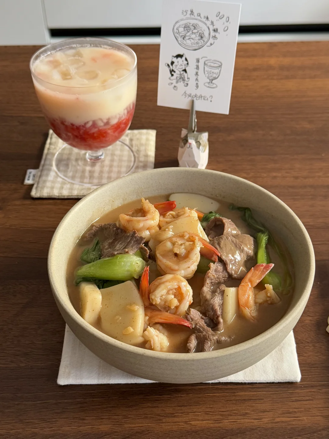今天午餐给自己煮了一锅超满足的沙茶牛肉虾仁汤年糕! 浓郁的沙茶汤底裹着糯叽叽的年糕,牛肉嫩滑,虾仁Q弹,吸饱汤汁的青菜也超入味~热乎乎一锅端,吃起来真的太幸福了! 🍓 搭配自制草莓养乐多: 几颗新鲜草莓捣碎+爆爆珠+养乐多,瞬间点亮这顿饭! 💡 汤年糕步骤: .沙茶酱、花生酱、蒜末先炒香 .倒入水,加生抽、雨露调咸鲜味,煮开 .年糕片、虾仁放入汤中煮2分钟,放青菜煮1分钟 .再嫩牛肉烫熟即可 📌 适合一人食的快速午餐,食材简单一锅出,营养美味都有了!
