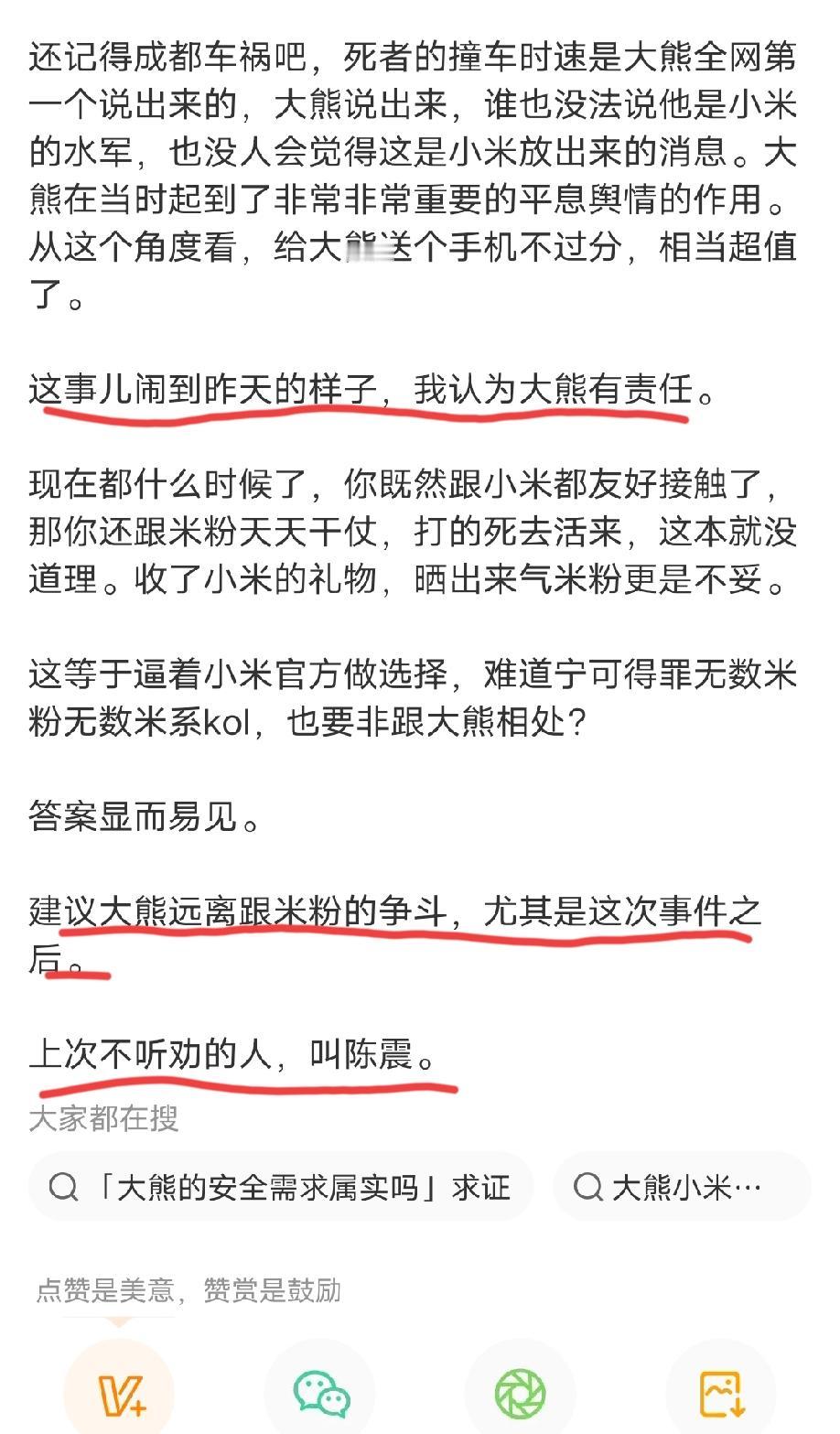 圈内人士透露“小米与相关kol接触”的更多细节。小编总结了一下,主要有以下几点: 1、双方最早接触可能是在去年9月份。 2、双方从来没有想过深度绑定。小米就送了一台手机,也没有所谓的年框。 3、大熊要的是安全,通过早期跟小米的接触,他也成功的逃过了被封杀。 4、小米只想把大熊当备用,在小米成都车祸中,大熊在当时起了非常重要的平息舆论的作用。 …… 这位博主这里面说的有几分真、几分假,大家自行判断。 最后,这位博主还给大熊提了建议,让他远离跟米粉的纷争。还说“上一个不听劝的,叫陈震”! 现在的商战,真的是无所不用其极了!