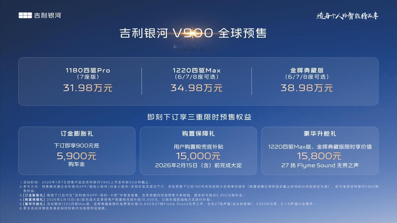 吉利银河V900正式开启预售,预售指导价格区间为31.98万元~38.98万元,