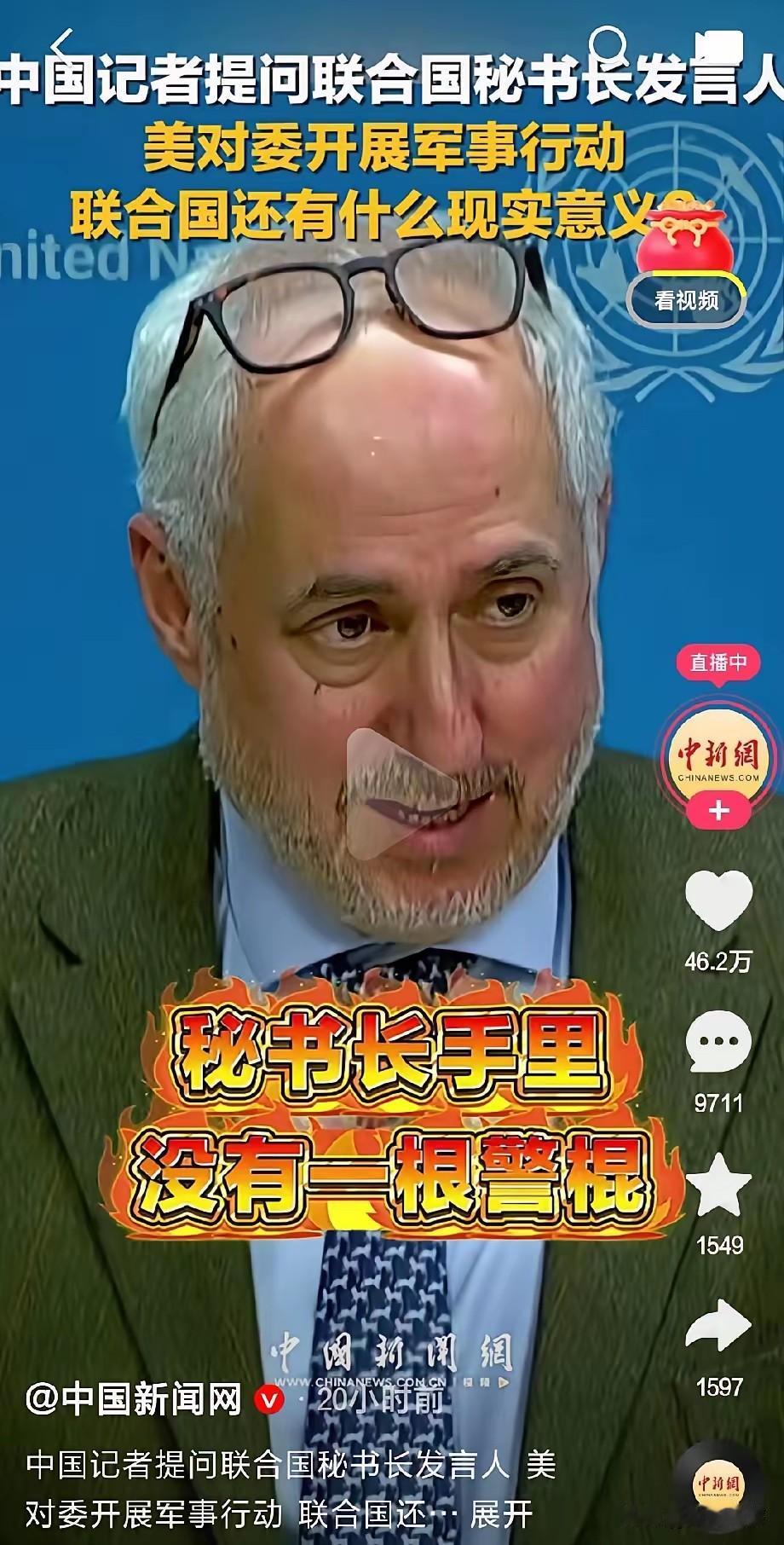 大快人心!中国记者的一个灵魂拷问,直接戳中联合国的痛处! 当着全世界媒体的面,他犀利发问:美国都上门绑架别国总统了,联合国还有存在意义吗? 这话问得太绝,直接替全世界憋了一肚子火的人出了口气。 联合国秘书长发言人听完,当场就露出了尴尬神色。 他没法正面回答,只能反复重申各国要遵守规则。 最后憋出一句心酸又无奈的话:秘书长手里也没有警棍,能敲打成员国的脑袋。 这话听着像实话,却把联合国的无力暴露得彻彻底底。 一边是美国肆意践踏国际规则,一边是联合国束手无策。 这样的联合国,到底还能不能守护公平正义?