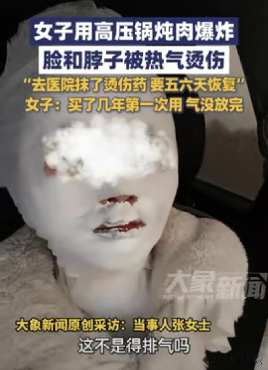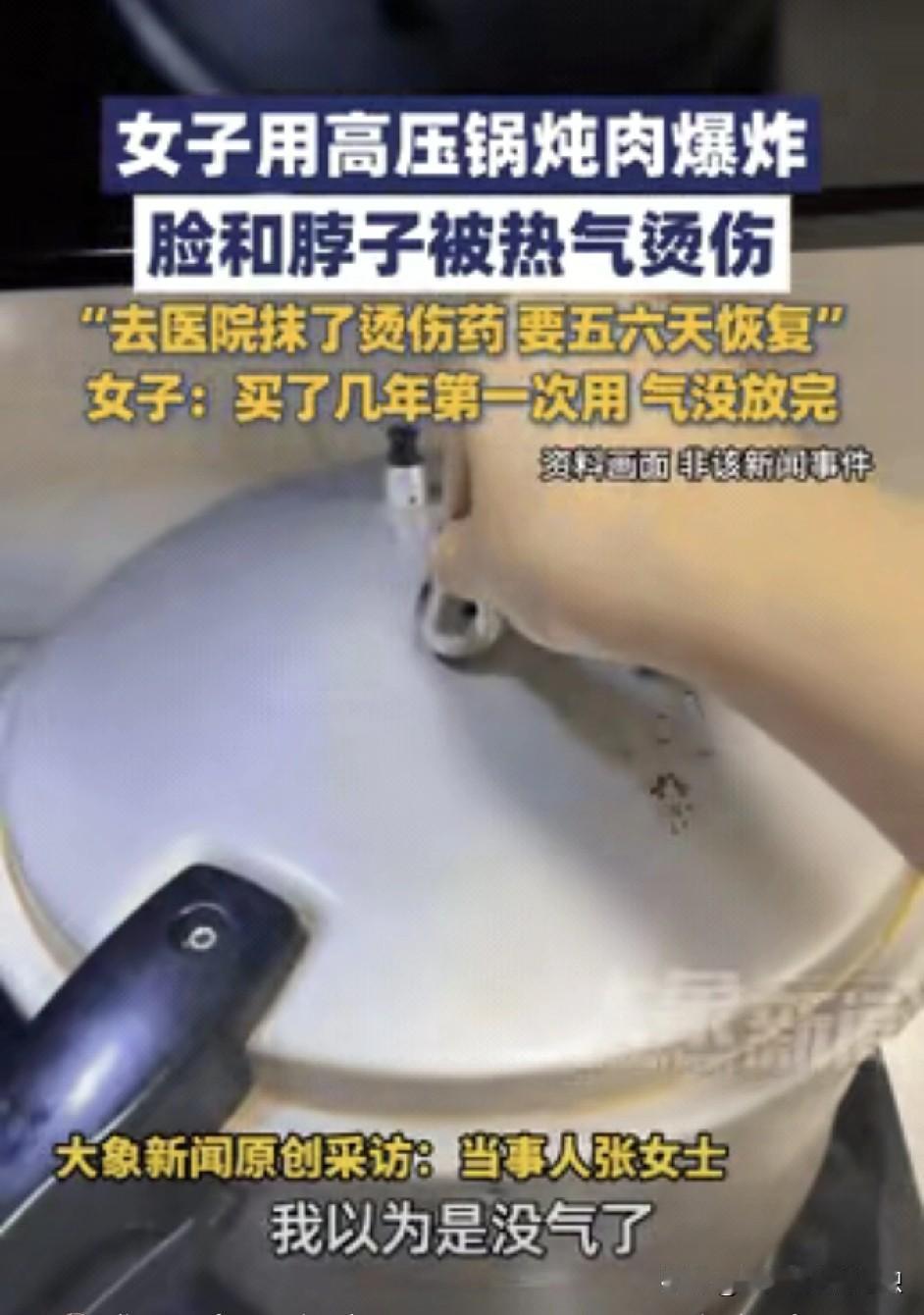 河北保定的一个女孩儿,第一次用高压锅炖肉。 炖了一会儿,她看到小红盖掉下来了,以为气排完了,就准备开盖。 没想到一打开,高压锅炸了,里面的热气和汤全溅出来了,脸和脖子都被烫伤了。 她赶紧去医院了。医生给她处理伤口后说,要恢复得需要5、6天时间。这是非常危险的一件事儿,也是一个非常惨痛的教训。 网友说,她强行开盖是错误的,也是非常危险的。安全使用高压锅的方法应该仔细阅读说明书后再使用。 这里简单说一下高压锅的使用方法:1、锅盖与锅体吻合良好,不漏气,不走气。 2、食品在锅内的高度不得超过锅内标明的最大限度线,以免食物膨胀后堵塞安全阀。 3、按照规定的量装入水或汤,不少于0.5升,不超过1.5升,以免干烧和食物膨胀。 4、根据食物种类和量的多少,适当缩短或延长炖煮时间,但不得超过规定时间。 5、蒸汽排出后,打开锅盖。如果发现高压锅有异响或异味时,应立即停止加热,远离锅体并让其自然冷却。 安全使用高压锅,给我们带来方便,危险使用高压锅,会造成严重后果,一定要谨慎使用。
