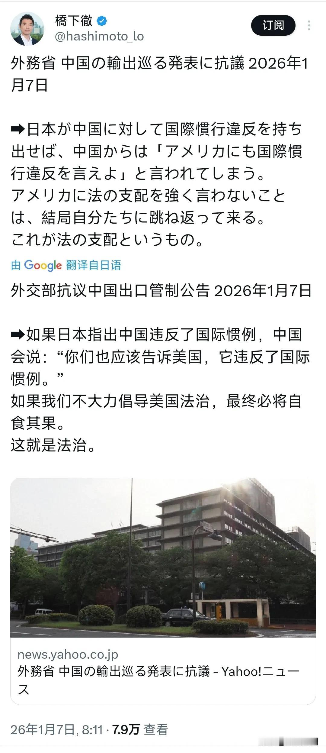 日本维新会创始人桥下彻今天(1月7日)发文写道:“外务省抗议中国出口管制公告。如果日本指出中国违反了国际惯例,中国会说:‘你们也应该告诉美国,它违反了国际惯例。’如果我们不大力倡导美国法治,最终必将自食其果。这就是法治。” 评几句: 作为主张对华强硬的日本维新会创始人,桥下彻这番“法治论”根本是偷换概念的双标话术。双标法治,本质是政治投机的遮羞布,他刻意回避核心前提——中方1月6日的两用物项出口管制,本就是对高市早苗涉台错误言论的反制,禁令明确禁止稀土、镓、碳纤维等1100余项关键物项用于日本军事用途,完全符合《出口管制法》和国际防扩散规则。 桥下彻闭口不提美国频繁动用单边制裁、违反国际法的事实,却要求日本“倡导美国法治”,本质是为日本的投机操作找借口。要知道,日本军工高度依赖中国稀土加工产能,F-35战机、苍龙级潜艇的核心部件都离不开中国材料,禁令已让三菱重工等企业面临生产线停摆风险。他的发声,不过是怕日本自食政治操弄的苦果。 真正的法治从不是选择性适用,更不是对美盲从、对华施压的双重标准。政治操弄的算盘,终究抵不过现实利益的铁拳,日本若真想谈“法治”,先应恪守一个中国原则,停止借“台湾有事”炒作扩张——否则,触碰核心利益的反制只会更精准,再精巧的话术也掩盖不了自食其果的必然。