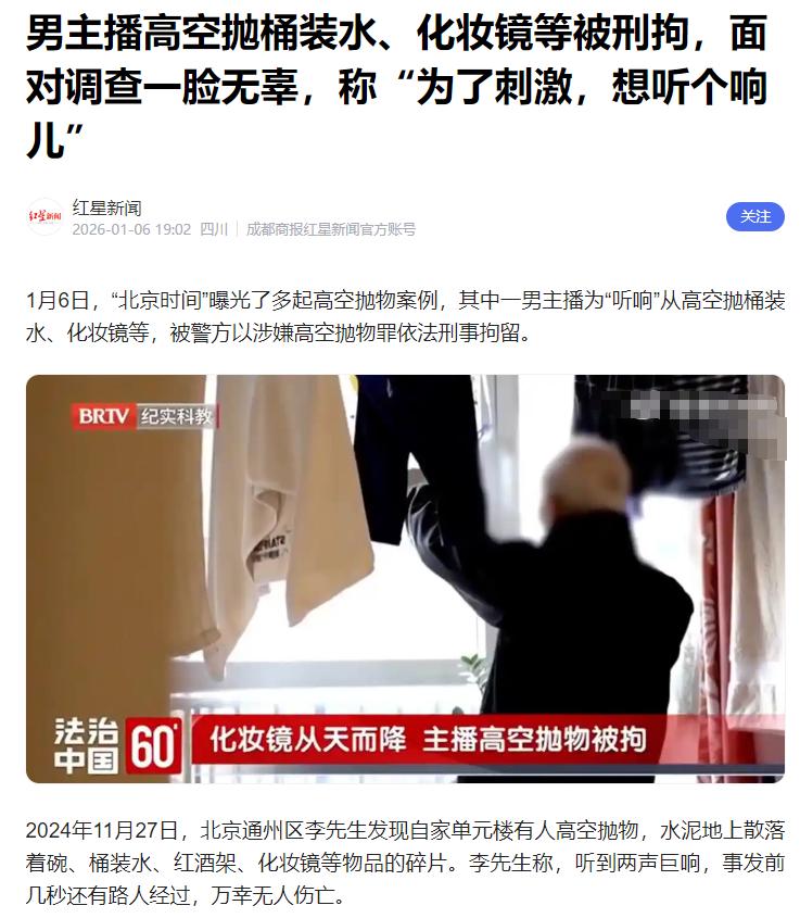 北京通州,李先生忽然听到两声巨响,他低头一看,瞬间吓得魂飞天外,只见水泥地上散落着碗、桶装水等一系列物品的碎片,而就在刚刚,还有路人从这里经过! 好在没有砸到人,这要是谁被砸伤了可怎么是好?惊魂甫定的李先生立刻联系了民警。 经过调查,民警发现事发小区没装有固定的防盗纱窗,也就是说,如果不是从外面强行打开的话,这个窗户是不会打开的。 难道是故意而为之?有心之人与楼下的某位住户结仇,存心想伤害他吗? 前来调查的民警意识到了问题的严重性。他们发现只有13层某租户家的窗户被拆了下来,莫非凶手就在里面? 民警随手敲了敲门,发现对方没有任何回应,看来是不在家。 这时有路过的邻居告诉民警,13层的住户是一家租户,中介那里应该有他们的信息。 于是民警和李先生一起联系了中介,通过对方得知,该租户当时正在办理交接手续,现在已经搬走了。 这明显是早有预谋的行为,否则他为什么这么慌里慌张的要搬走呢? 有了人证,还要有物证,所谓物证,就是小区的监控视频。 通过调取监控民警有了新的发现:案发的时间段,男子林某曾进入十三层这个区域。 从目前的种种迹象来看,这个林某应该就是13层的租户,也就是他将这些坛坛罐罐,随意从高空抛下,险些造成了严重的后果。 锁定人选之后,民警立刻上门,因为搬家显然不是一次就能结束的,林某一定会回来收拾剩余的物品,这一次李某被堵在了家里。 “您好,请问是林先生吗?” “是啊,我就是,你们这是……。” 民警亮出了证件,并严肃的告诉林先生:“你涉嫌高空抛物,请你跟我们回去,接受我们的调查。” 林某的脸上竟然显现出了一种戏谑的表情,他根本就没有把高空抛物当回事。 “我这不就是随便玩玩而已嘛,想听个响!我没有故意伤害别人的意思啊,同志。” 办案的民警直接给气乐了,因为压力大,就要高空抛物,就要威胁别人的生命安生命安全,这是什么逻辑? 林某因涉嫌高空抛物罪,目前已被刑事拘留,等待他的将是严厉的惩罚。 事实上,林某的行为并非个例,高空抛物已经成了一大难题。 2022年2月2日夜里两点的时候,同样是在北京西城区的某小区内,突然闪现出点点星火,随后火势渐成燎原之势。 风助火势,火借风威,迅速蔓延的烈火烧毁了一楼的小院,还有停放在那里的电动车。 随后,火势向室内蔓延,烧毁了室内的许多物品,造成严重财产损失,预估金额达到3万元。 好在由于发现及时,没有人员伤亡,经过调查,在现场发现了还没有燃尽的烟头。 此案件的侦破方向转向高空抛物方向,为了将这个危害大家安全的人找出来,有人花钱租下了对面的房间,通过查看里面的摄像头,发现肇事者是九楼的王某。 当大家找到这个肇事者王某的时候,他的回答让所有人惊掉了下巴:“我就是打游戏打输了,心里烦,我抽根烟随手就扔了,怎么了?” 他还振振有词地说:“哪个男人不抽烟,你们要找我的事?” 最终,王某被判处有期徒刑六个月,并处罚金2000元,为自己的行为付出了代价。 根据《刑法》第二百九十一条之二规定,从建筑物或者其他高空抛掷物品,情节严重的,处1年以下有期徒刑、拘役或者管制,并处或者单处罚金。 有前款行为,同时构成其他犯罪的,依照处罚较重的规定定罪处罚。 这也就是说,面对高空抛物带来的不法侵害,受害者有权拿起法律,捍卫自己的权利。 本案中,林某与王某的行为,无论他们自己怎么说,事实上都是故意的,只不过没有造成人员伤亡,够不上“情节严重”而已。 另外,两人的行为还有可能涉嫌故意伤害罪。 《刑法》第234条,致人轻伤处三年以下有期徒刑、拘役或管制;致人重伤处三年以上十年以下有期徒刑;致人死亡或以特别残忍手段致重伤造成严重残疾的,处十年以上有期徒刑、无期徒刑或死刑。 如果二人高空抛物,致使他人受到伤害,还可能构成故意伤害罪。 本案也提醒大家,切莫图一时之快触碰法律红线,给自己的人生留下污点。 信源:红星新闻