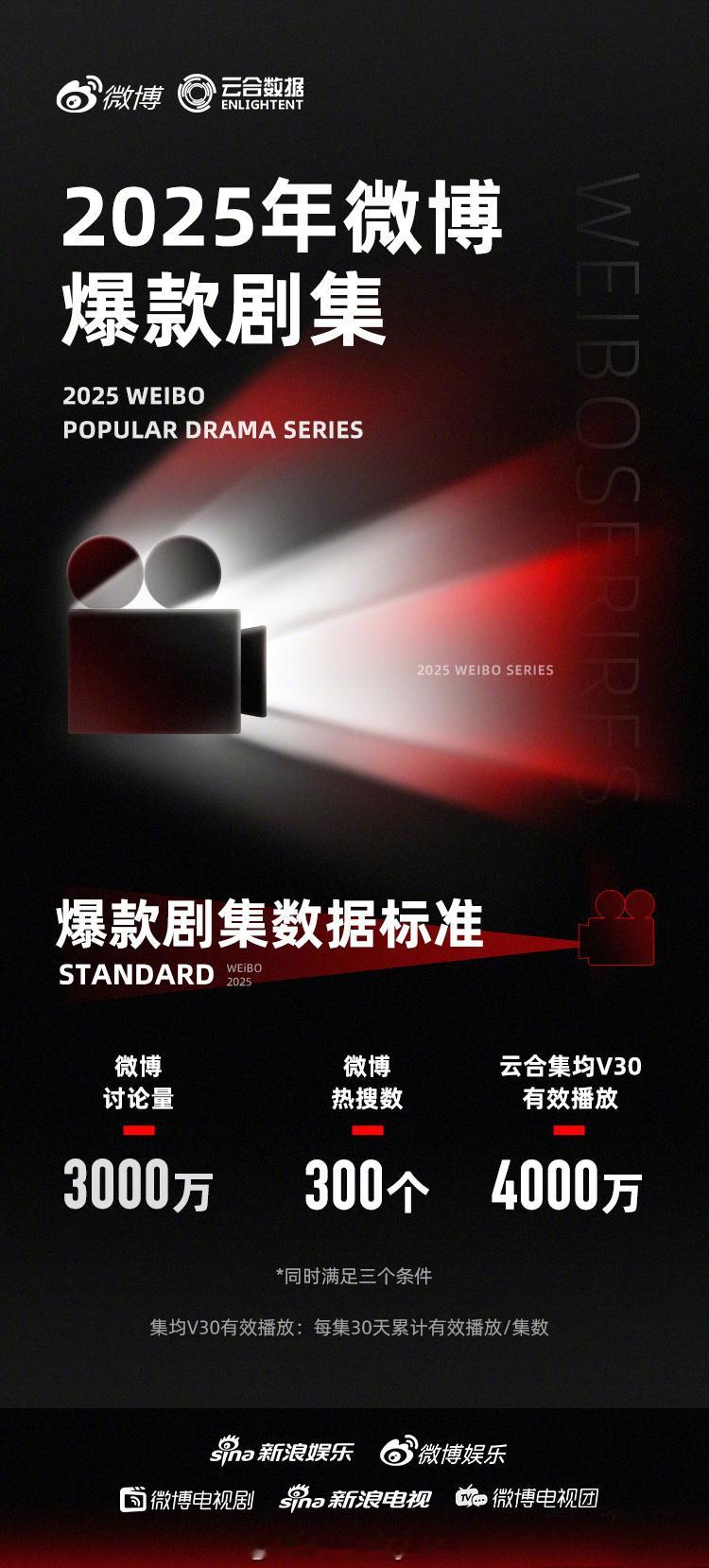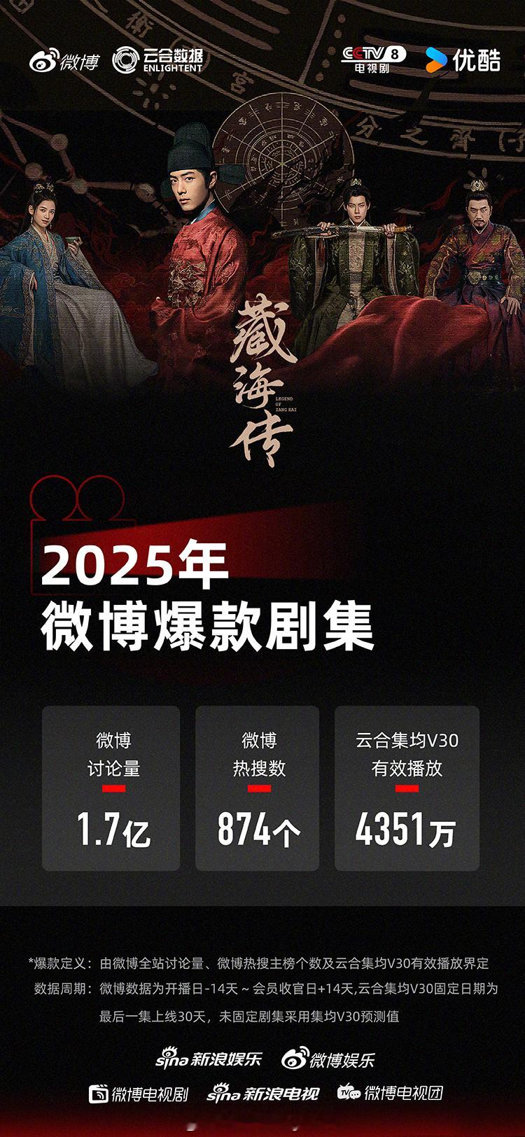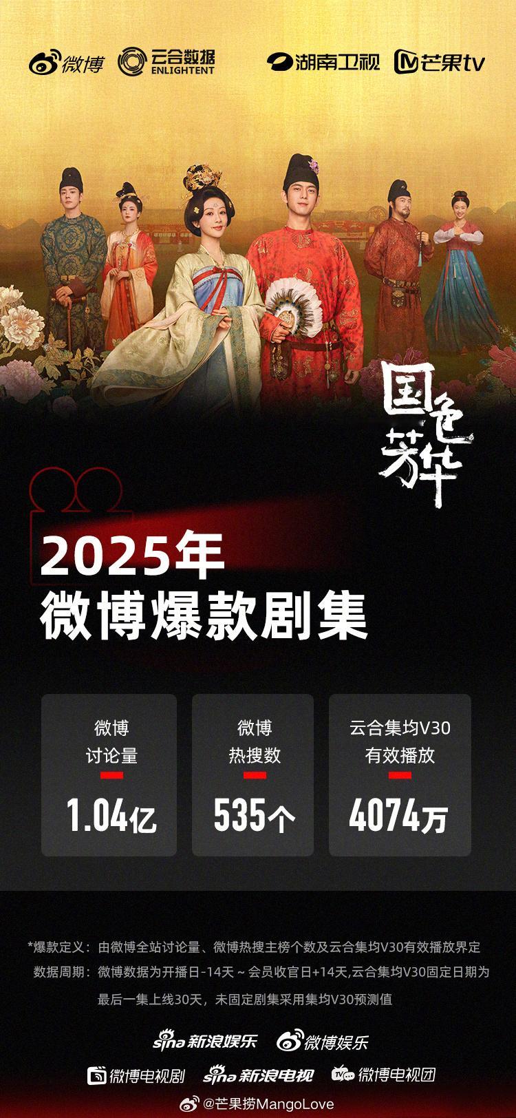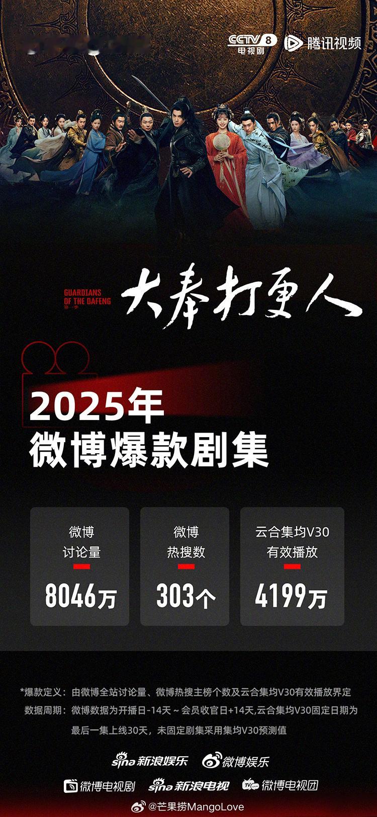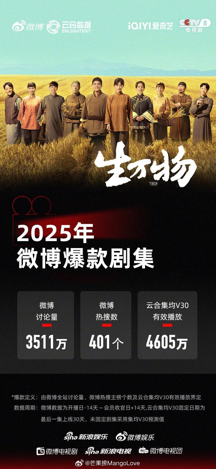 2025年微博爆款剧集认证五部:檀健次 / 金世佳 《猎罪图鉴2》王鹤棣 / 田曦薇 《大奉打更人》杨紫 / 李现 《国色芳华》肖战 / 张婧仪 《藏海传》杨幂 / 欧豪 《生万物》标准:微博讨论量≥3000万,微博热搜数≥300,云合集均V30有效播放量≥4000万