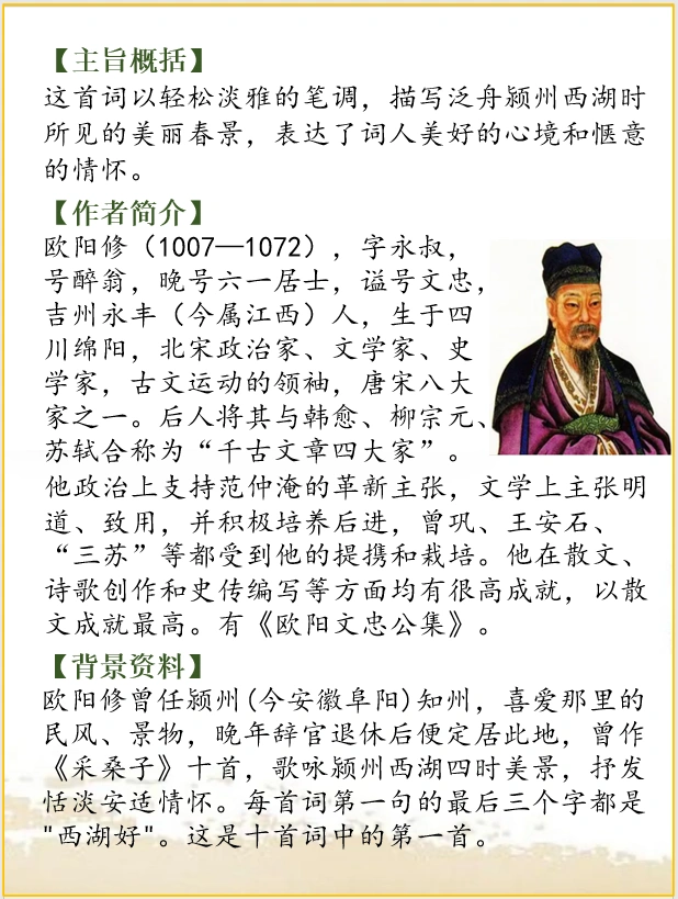 欧阳修曾任颍州(今安徽阜阳)知州,喜爱那里的民风、景物,晚年辞官退休后便定居此地,曾作《采桑子》十首,歌咏颍州西湖四时美景,抒发恬淡安适情怀。每首词第一句的最后三个字都是"西湖好"。这是十首词中的第一首。