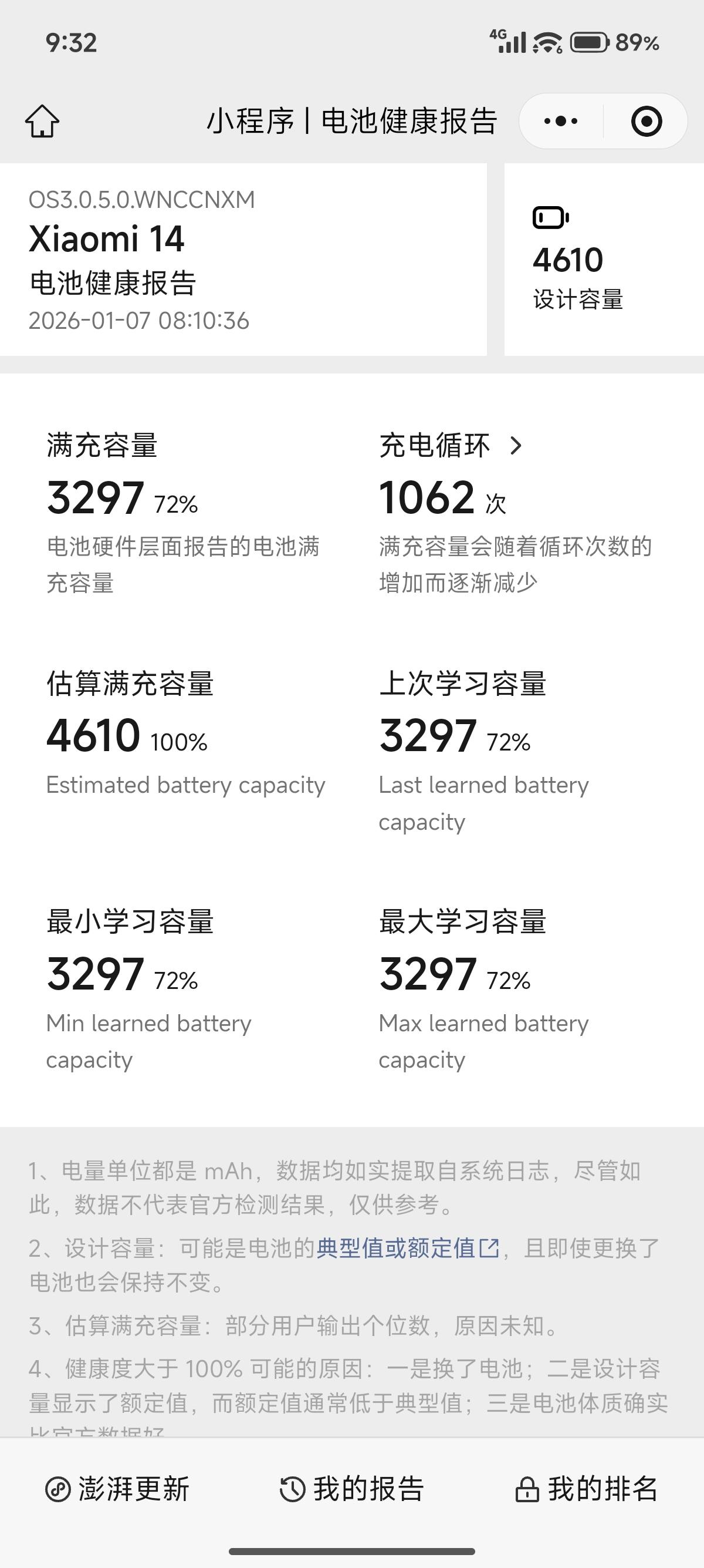 小米 14 自 2023 年 11 月 3 日激活,直至今日(2026 年 11 月 7 日),电池健康度已衰减至 72%。 从 2023 年 12 月 3 日激活到 2026 年 1 月 7 日,总计 2 年零 66 天,手机电池健康度便从 100%降至 72%,已然到了可更换电池的时候。 我特意查阅资料,还致电咨询了当地小米维修授权服务商,得知小米 14 电池价格为 159 元。 亲爱的小米 14 用户们,你们的手机是否到了该换电池的时候?有没有查看过自己手机的电池健康度呢?