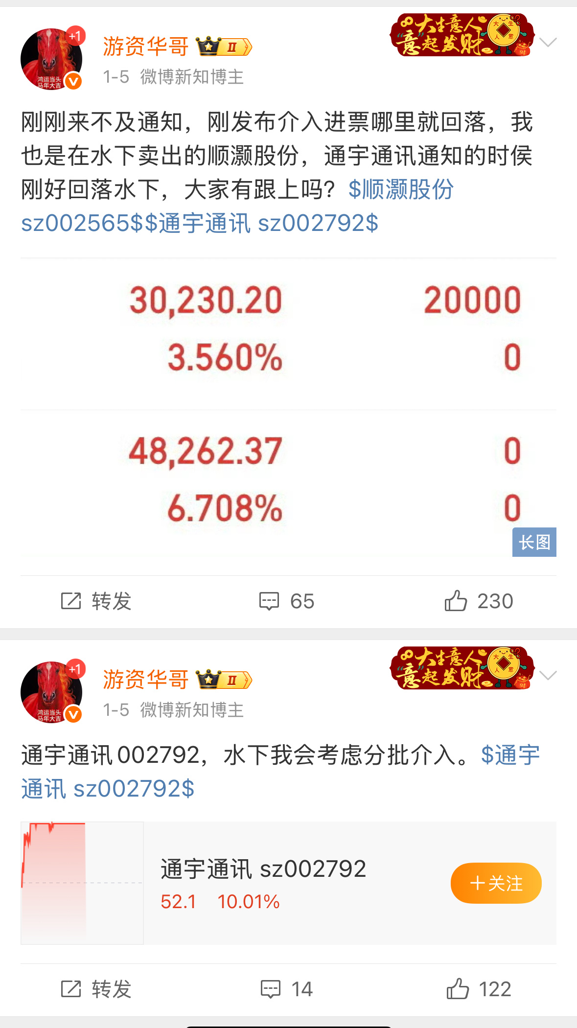 通宇通讯002792,从周一低吸到今天目前为止是三十多个点的利润,跟上的都有不少肉吃!我说一下今天逻辑:通宇通讯开始走加速完全可以摆脱30天200%的异动,从周一低开高走到周二低开高走在回落,纯粹就是在洗盘,再到今天的高开换手,炸板换手,第一是在吓走量化,第二是在吓走获利盘,第三是在让大家手里的筹码成本变高。在加上今天炸板快速大单回封来看,大概率从明天开始会跟雷科一样走加速。这种博弈我还是愿意继续持仓的!!!言尽于此!!!