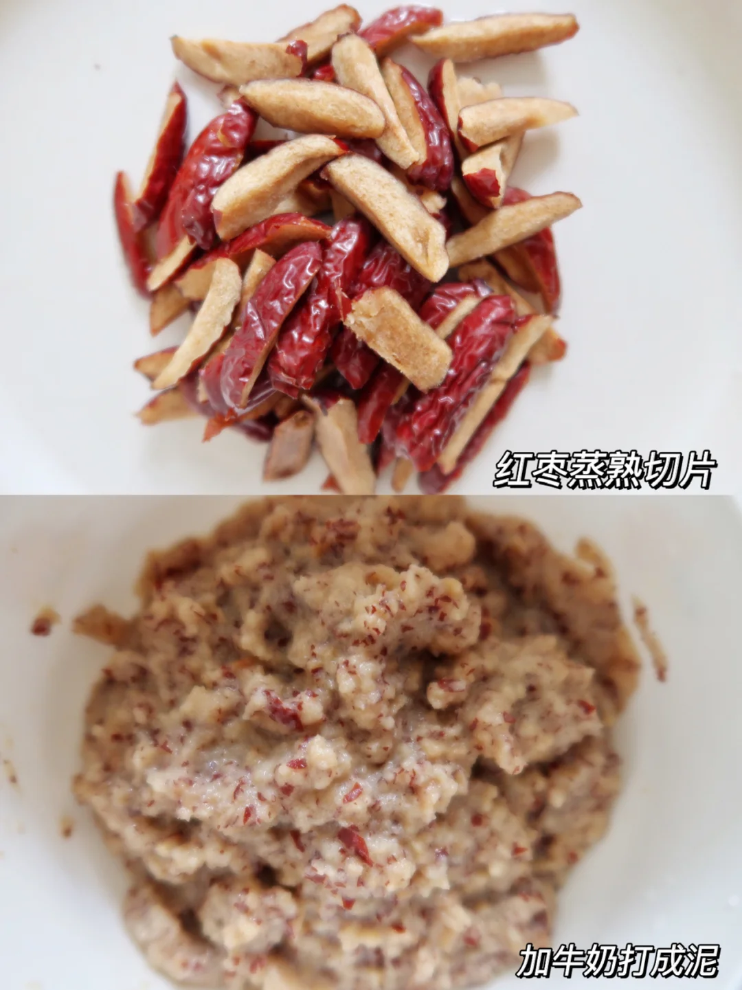 今天分享一款月亮每次光盘的香甜软糯的小饼,不用添加任何调味品,小宝贝们都可以吃,山药红枣富含维生素B和氨基酸,所以很适合小盆友们吃,而且很简单,妈妈们赶紧安排吧! 材料: 红枣8颗,山药120克,芝麻少许,面粉35~40克 制作: 1、红枣蒸熟切片加入牛奶打成泥 2、山药蒸熟碾成泥,加入面粉揉成面团 3、枣泥放入锅中小火翻炒,不然会有点稀,翻炒后放入山药面团中,虎口收回按压成饼,用刀划口撒上芝麻,煎至两面金黄即可