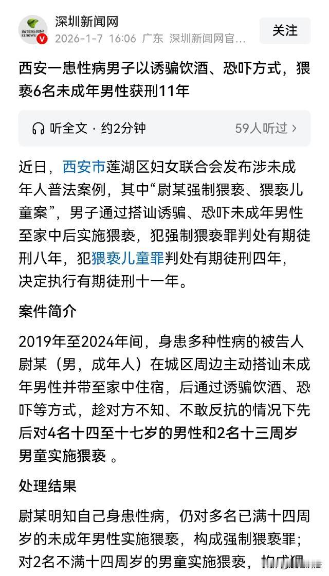 陕西西安,男子尉某身患多种病,仍和多名未成年男性搭讪,将他们带回家后,通过引诱喝酒或者恐吓的方式,对4名14至17岁的男性和2名13岁的男童实施了侵犯。 据深圳新闻网报道,西安市莲湖区妇联发布了一起涉及未成年人的普法案例,受害人是6名未成年男性。 据报道,尉某是一名成年男子,但是他不喜欢年轻貌美的小姑娘,反而对同性颇感兴趣。 因为长期混迹于混乱场所,和不同的人交往,魏某竟然染上了多种病。 魏某这个群体有自己的圈子,时间一长,大家都知道了尉某的情况,尉某在圈子里名声也臭了。渐渐的,就没有人愿意再和尉某交往了。 尉某在圈子里混不下去了,就将目光投向了未成年男孩们。 2019年开始,尉某便开始在城区周边主动搭讪未成年男性,这些未成年男性涉世未深,认识后,尉某就提出带他们回自己家玩,等到将人带回家后,尉某又留他们住宿。 年纪大一点或者看起来比较机灵的,尉某就诱骗他们喝酒,等他们喝醉不知反抗,尉某便开始实施侵犯。 年纪小或者看起来老实的,尉某就直接威胁恐吓,使得他们不敢反抗,然后开始实施侵犯行为。 就这样,从2019年开始,到2024年案发,尉某前后诱骗多人和他回了家,其中4名14到17周岁的男性,以及两名13周岁的男童均被尉某侵犯 猥 亵。 坏事做多了早晚会付出代价,案发后,尉某因涉嫌强制 猥 亵 罪和猥 亵 儿童罪被提起公诉。 那么问题来了,有人想不通,尉某侵犯了6名未成年人,为什么不构成强 奸 罪? 《刑法》第二百三十六条规定,强 奸 罪是指违背妇女意志,使用暴力、胁迫或者其他手段,强行与妇女发生了关系的行为,或者故意与不满14周岁的幼 女 发 生 关 系的行为。 从上述条款可以看出,在我国法律中,强 奸 罪的犯罪对象仅限于女性。 虽然在司法实践和社会观念中,对于性 侵 害的认知不断发展,但目前法律并没有将男性纳入强 奸 罪的犯罪对象范畴。 本案中,尉某侵犯的对象均为男性,所以他的行为不符合强 奸 罪 的构成要件,不能以强 奸 罪对尉某进行定罪。 那么,尉某为什么会同时构成强制猥 亵 罪和猥 亵 儿童罪呢? 《刑法》第二百三十七条规定,以暴力、胁迫或者其他方法强制 猥 亵他人或者侮辱妇女的,构成强制 猥 亵 罪。猥 亵儿童的,依照规定从重处罚。 强制猥 亵 罪和猥 亵 儿 童罪是两个不同的法律概念, 强制猥 亵 罪的对象是14岁以上的公民,而猥 亵 儿童罪的对象为不满14周岁的儿童。 本案中,尉某采用诱骗喝酒的手段,使得未成年人失去反抗能力。 这些未成年人由于涉世未深,缺乏对危险的预判,在尉某的哄骗下喝酒,酒精作用使他们意识模糊,处于不知反抗的状态。 这种诱骗喝酒的方式,属于其他方法中的一种,趁他们醉酒,尉某便实施侵犯,其行为违背了这些未成年人的真实意愿,符合强制猥 亵 罪 中其他方法的构成要件。 对于那些可能通过恐吓手段对待的未成年人,尉某以威胁的方式让他们不敢反抗。 未成年人虽然有一定认知,但面对成年且心怀恶意的尉某,心理上会产生恐惧,不敢反抗尉某的侵犯行为,同样违背了他们的意愿。 在此过程中,尉某还对2名13岁的男童实施了侵犯行为。 13岁的儿童心智尚未成熟,在认知和自我保护能力上明显不足。 尉某正是利用了这一点,或是通过恐吓让他们不敢反抗,或是采取其他手段使其处于不能反抗的状态,对这2名13岁的男童实施猥 亵。 值得注意的是,法律对儿童实施特殊保护,只要实施了猥 亵 儿童的行为,不论采用何种手段,不管是否获得了儿童的同意,都构成猥 亵 儿童罪。 尉某对儿童实施 猥 亵,应依照强制猥 亵 罪的规定从重处罚,所以构成猥 亵 儿童罪。 尉某针对不同年龄段的未成年人实施了侵害行为,4名14至17岁的未成年人和2名13岁的男童在生理和心理成熟度上存在差异,法律对他们的保护侧重点也有所不同。 将尉某的行为分别认定为强制 猥 亵 罪和猥 亵 儿童罪,能够更精准地反映其犯罪行为的性质和危害程度,实现罪责相适应,给予其应有的法律制裁,同时也能更好地保护不同年龄段未成年人的合法权益。 经审理认为,尉某明知自己患有多种性 病,仍对多名未成年男性实施猥亵,主观恶性较大,应从重处罚。 最终,尉某因强制猥 亵 罪获刑8年,因猥 亵 儿童罪获刑4年,决定执行有期徒刑11年。