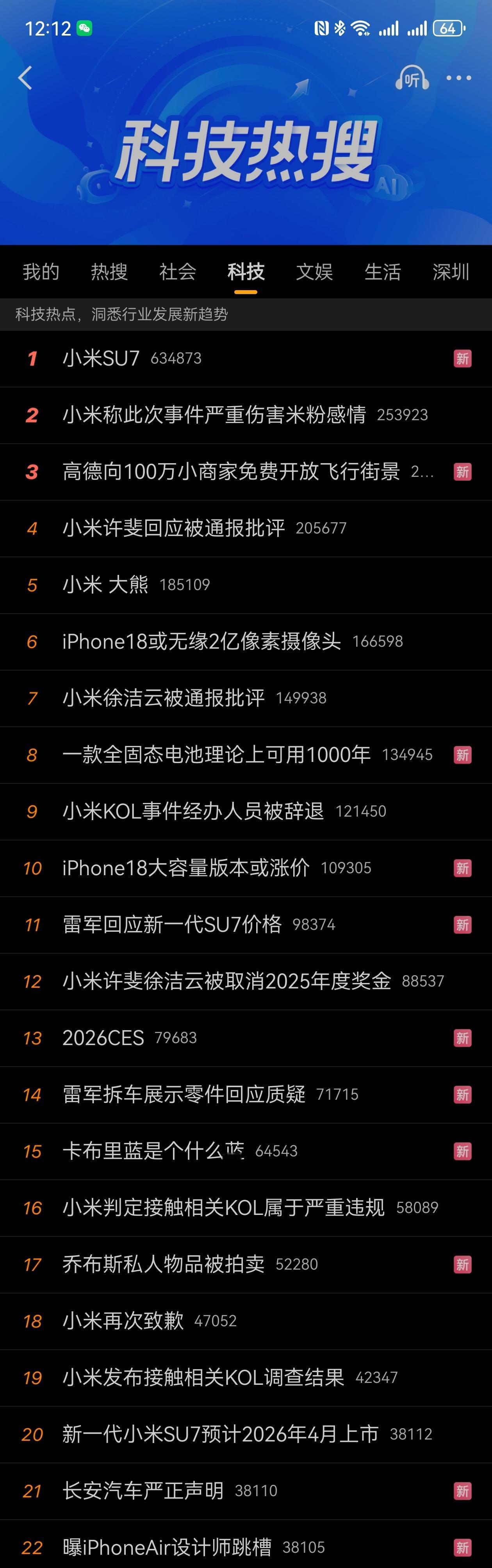 雷军雷总和小米果然是顶流,科技榜的前20里,有12个是他们的,太强悍啊。真的没有第二个公司有这样的能量。