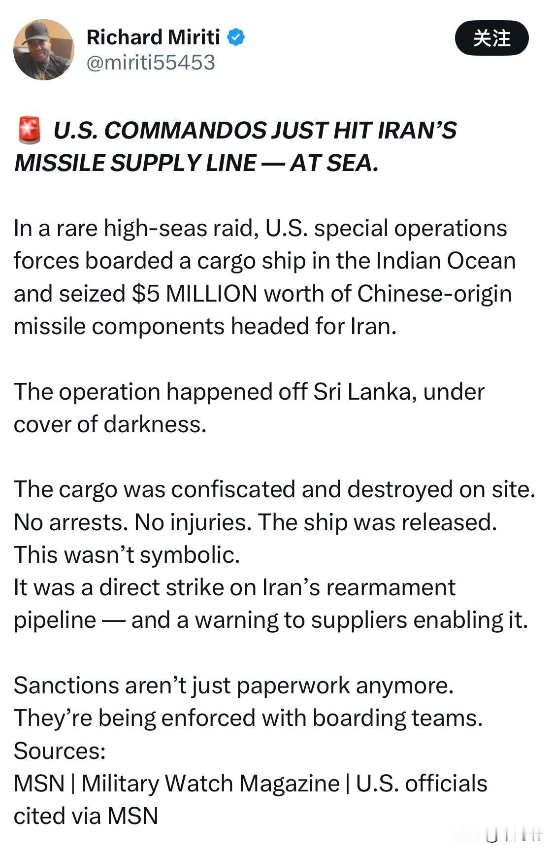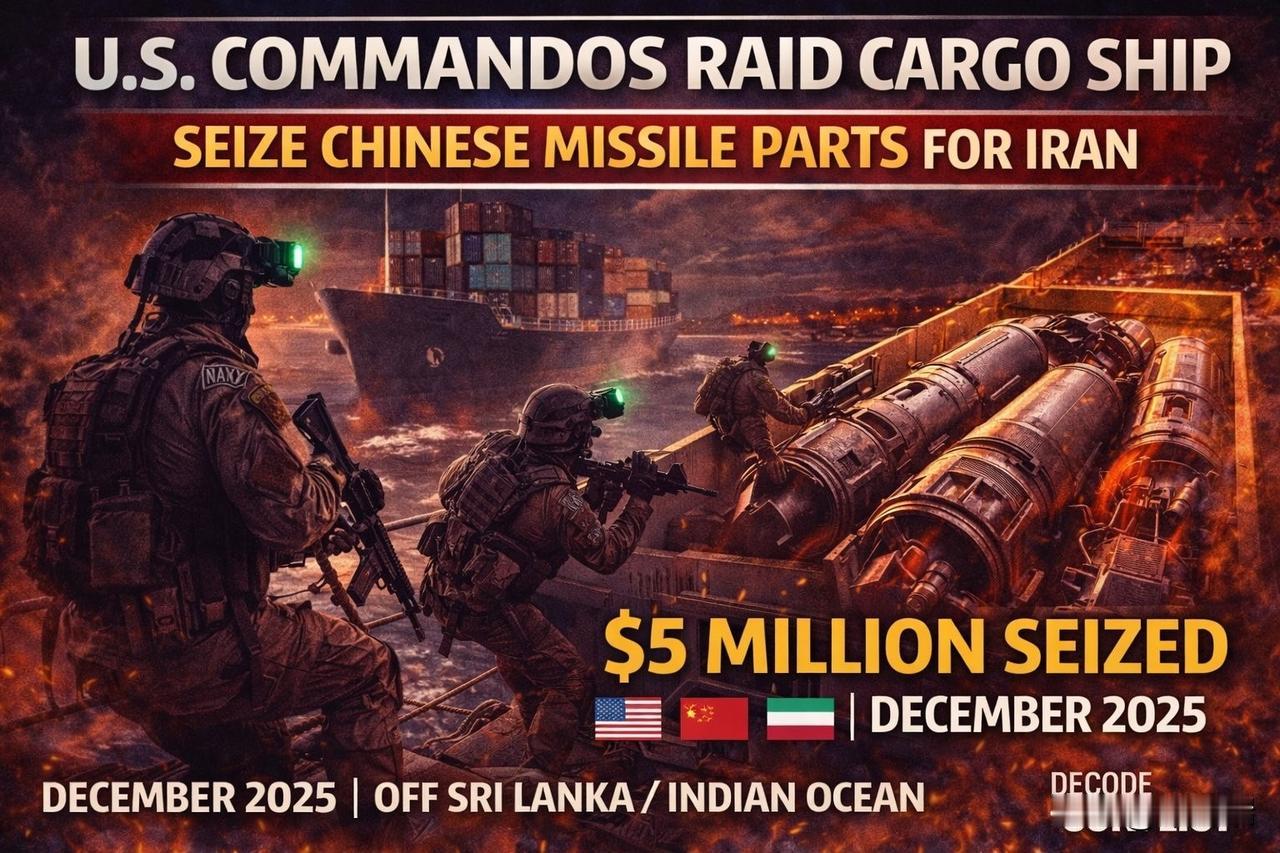 美国突击队刚刚在海上袭击了伊朗的导弹补给线。 在一次罕见的公海突袭行动中,美国特种作战部队登上了印度洋上的一艘货船,并查获了价值 500 万美元的中国产导弹部件,这些部件原本要运往伊朗。 行动在斯里兰卡附近海域进行,趁着夜色掩护。 货物已被没收并就地销毁。 无人被捕,无人受伤,船只已获释。 这并非象征性的。 这是对伊朗重新武装管道的直接打击,也是对为其提供武器的供应商的警告。 制裁不再仅仅是纸上谈兵了。 他们正通过登机小组强制执行这些措施。