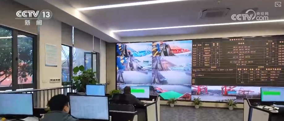 这里是重庆果园港集装箱码头的远程控制室,在这个控制室里一共是有12台这样的远程控制平台,工人们可以通过在现场来远程操纵两公里以外的码头上的龙门吊。32台龙门吊可以进行隔空取物协同作业,这样的工作模式相比传统的作业方式,效率能够极大提升35%以上。
